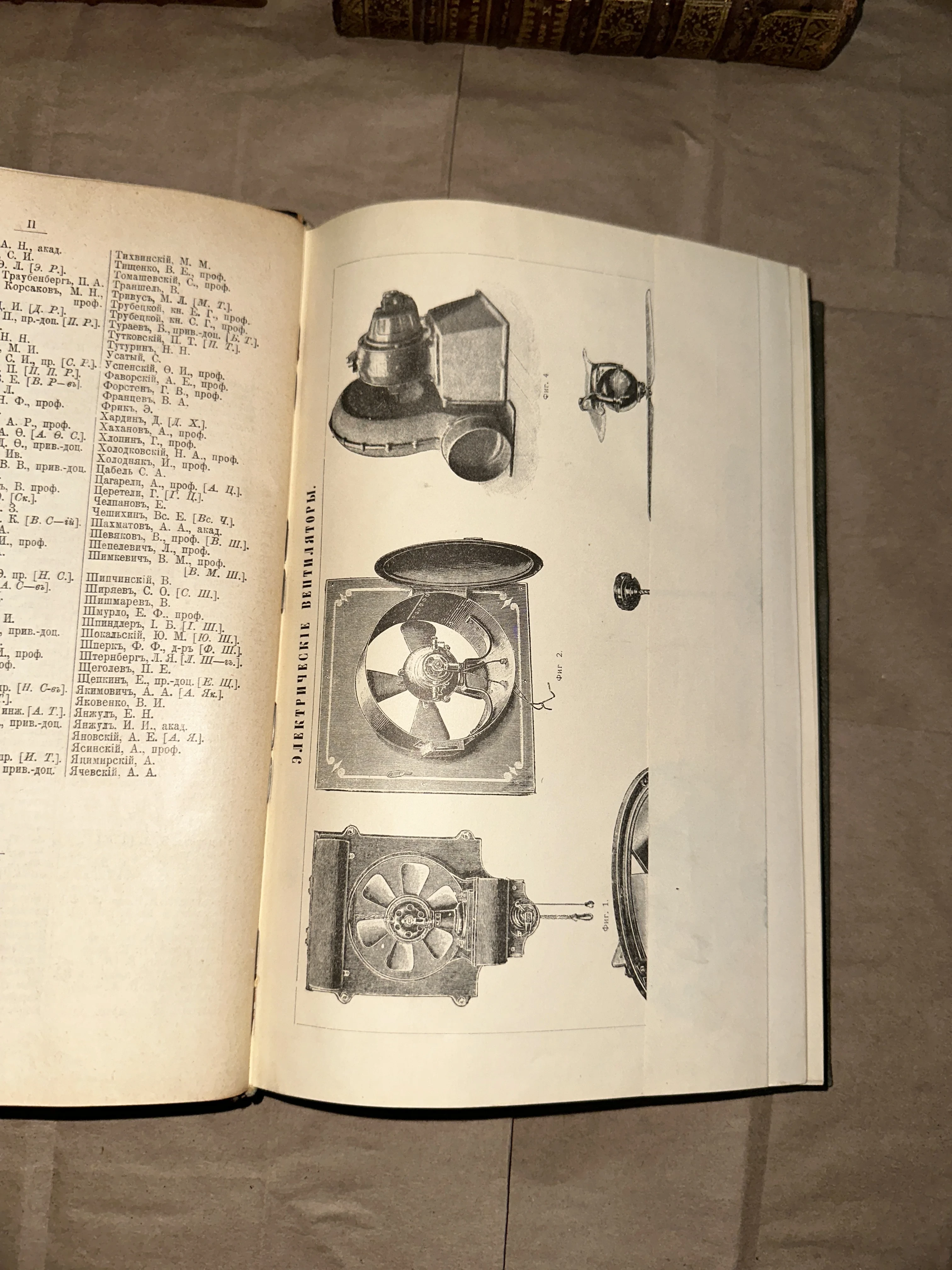 Перед вами редкий образец технической литературы начала XX века, запечатлевший зарю эпохи электрификации. Детальные гравюры вентиляторов поражают точностью исполнения, а соседствующий список авторов подчеркивает научную значимость издания. Книга сохранила очарование старины, передавая уникальную атмосферу инженерной мысли прошлого.