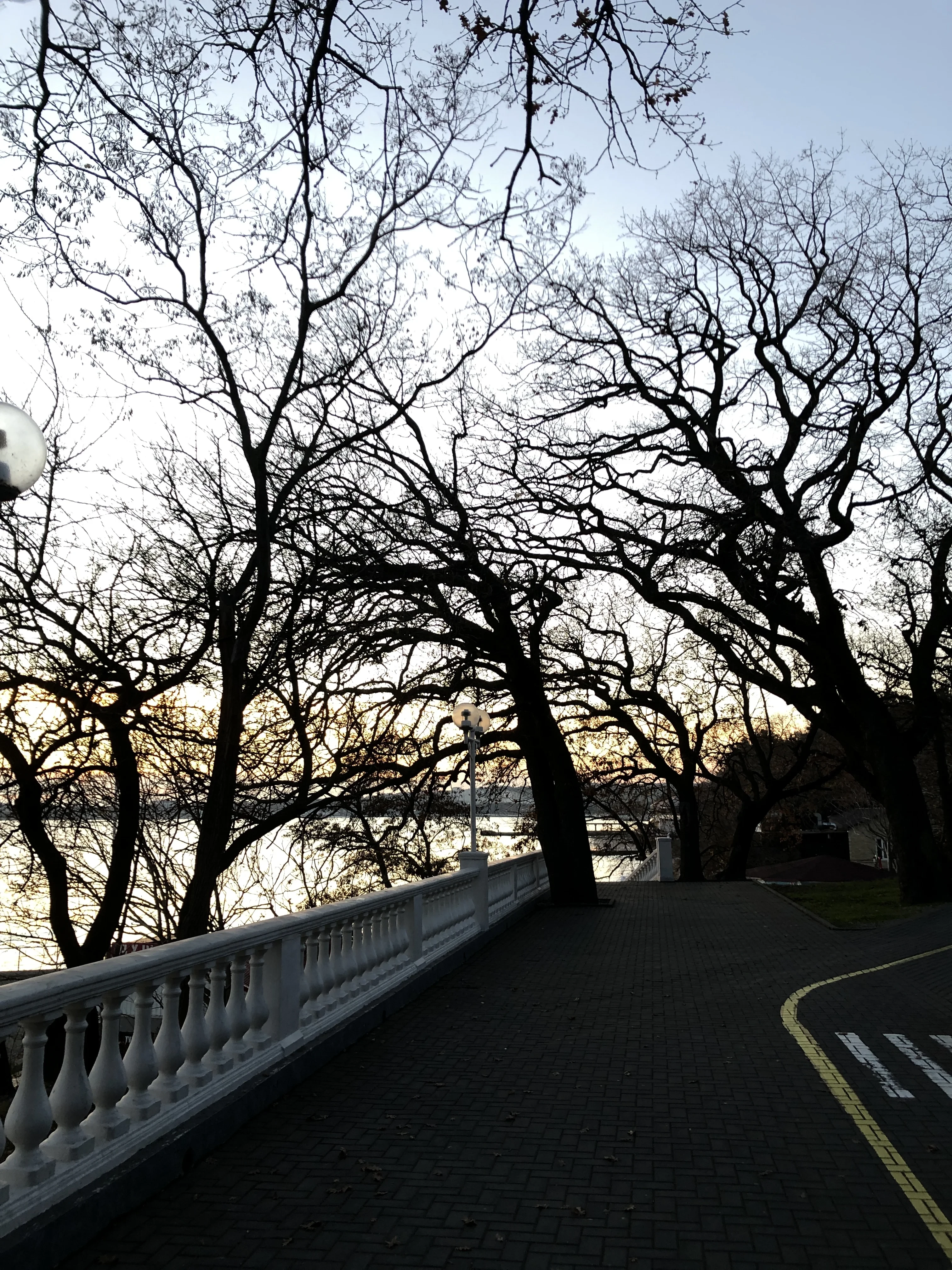 Изящная белая балюстрада и графичные силуэты вековых деревьев создают атмосферу тихого паркового вечера у воды. Снимок пропитан настроением ностальгии и спокойствия, напоминая о классических видах курортных городов прошлого столетия.