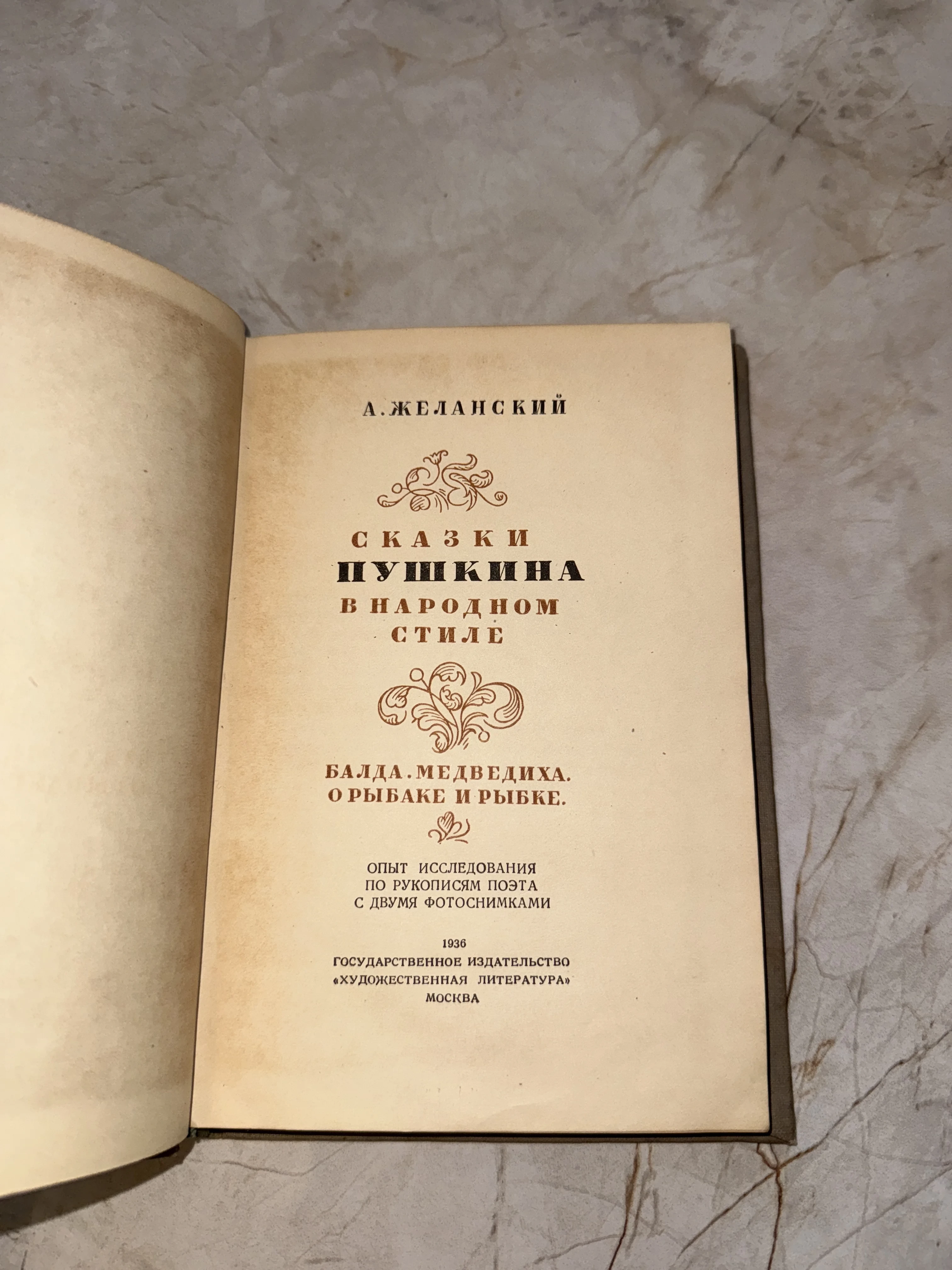 Титульный лист антикварной книги А. Желанского об исследовании сказок Пушкина по рукописям поэта, издание 1936 года.