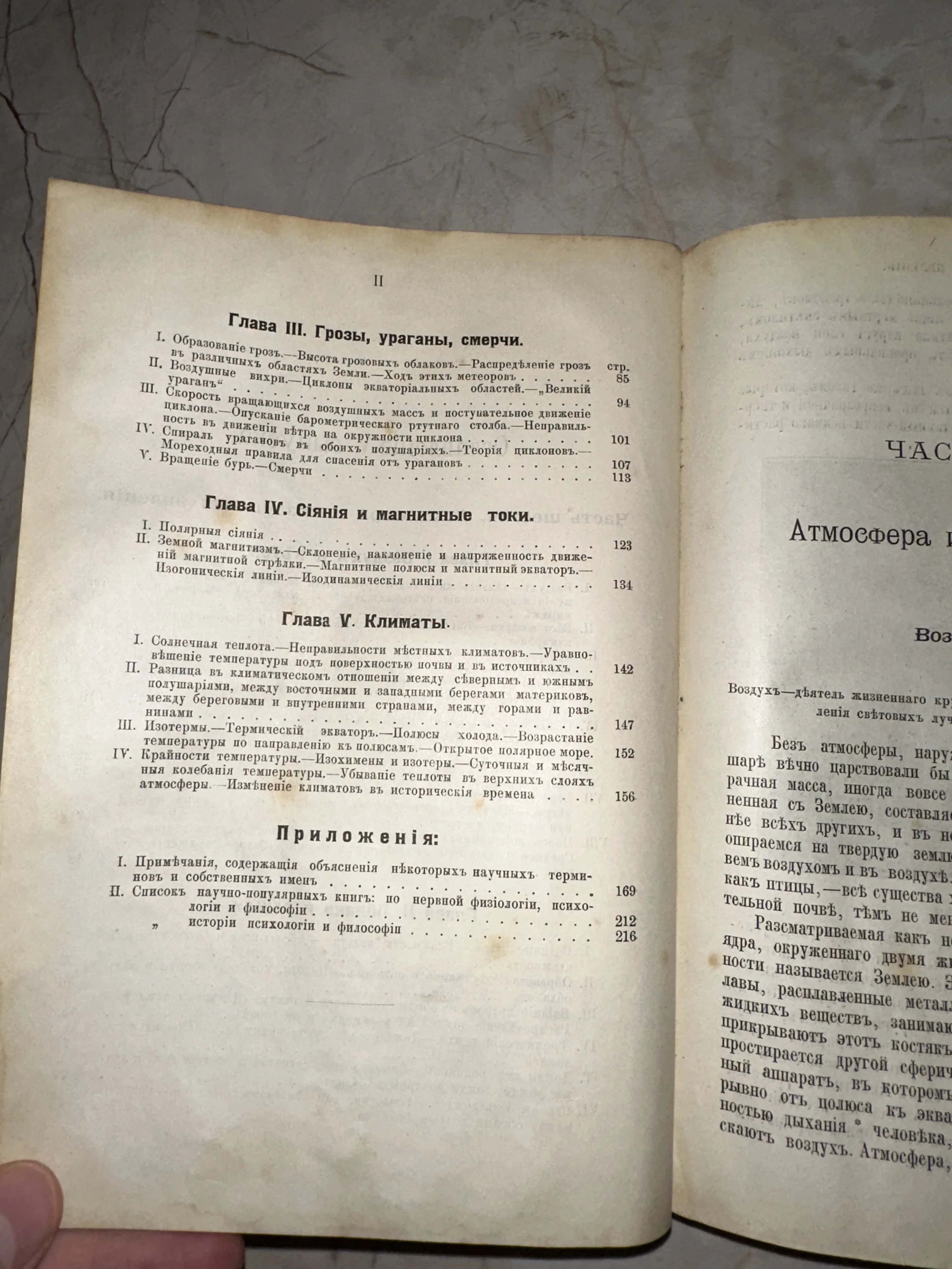 Разворот антикварной книги с оглавлением на дореволюционном русском языке, главы о грозах и климате.