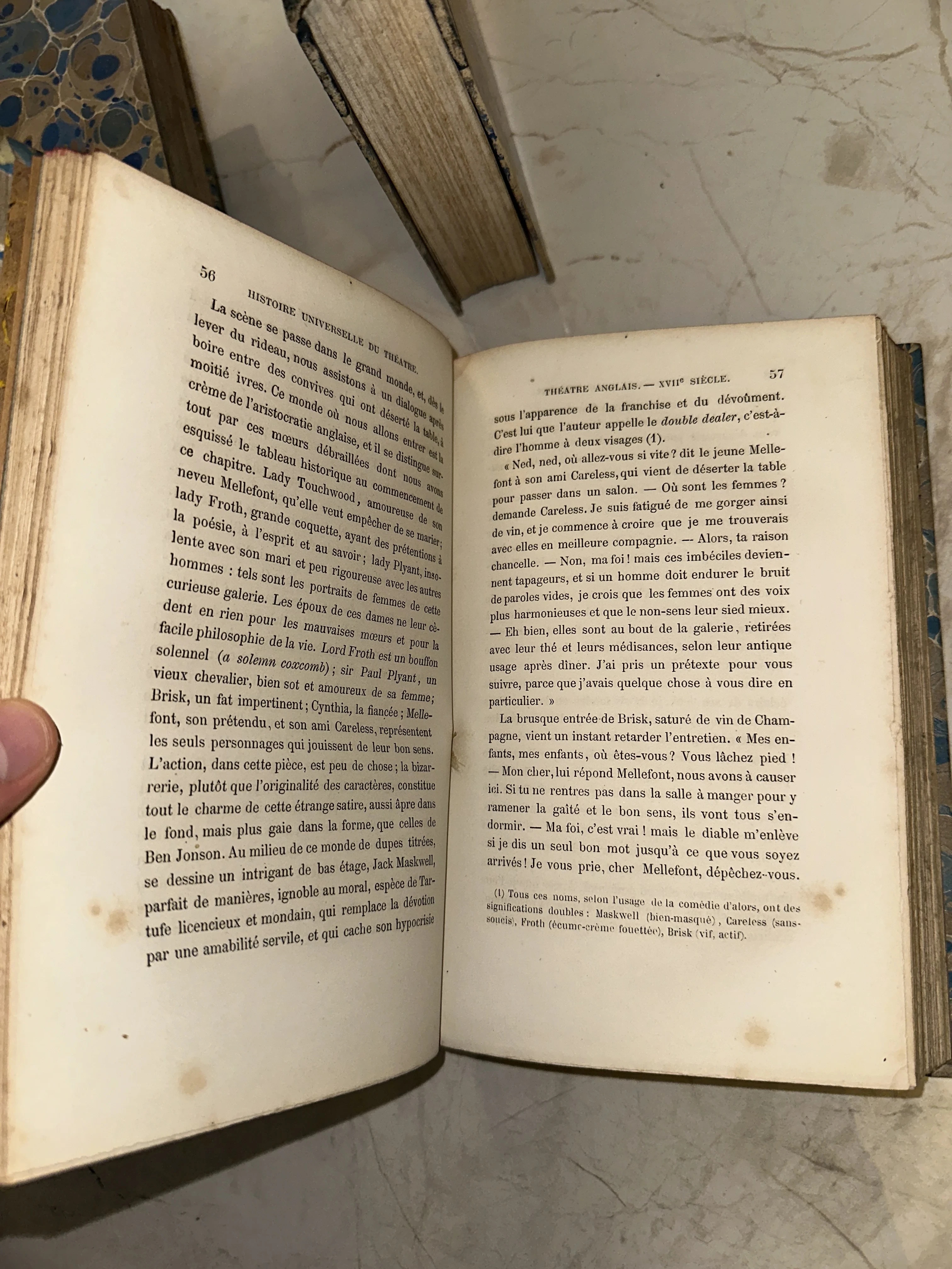 Разворот антикварной книги на французском языке с текстом об английском театре XVII века.