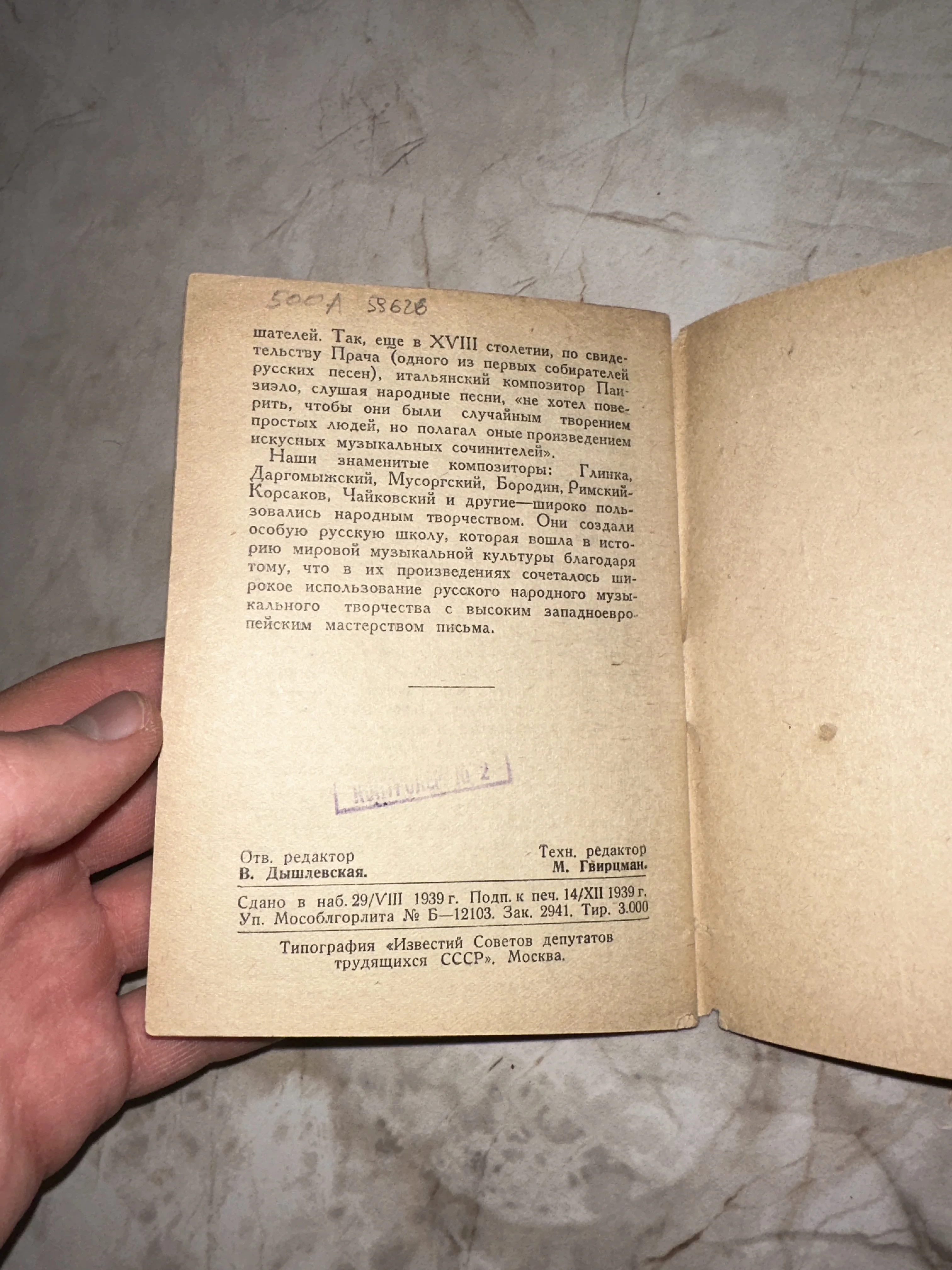 Редкий образец довоенной советской литературы, посвященный анализу влияния народных песен на творчество великих русских композиторов. Страница хранит подлинную атмосферу эпохи: пожелтевшую бумагу, четкий типографский шрифт и архивные пометки, сделанные рукой исследователя. Издание представляет особую ценность для коллекционеров-музыковедов и любителей истории советского книгоиздания.