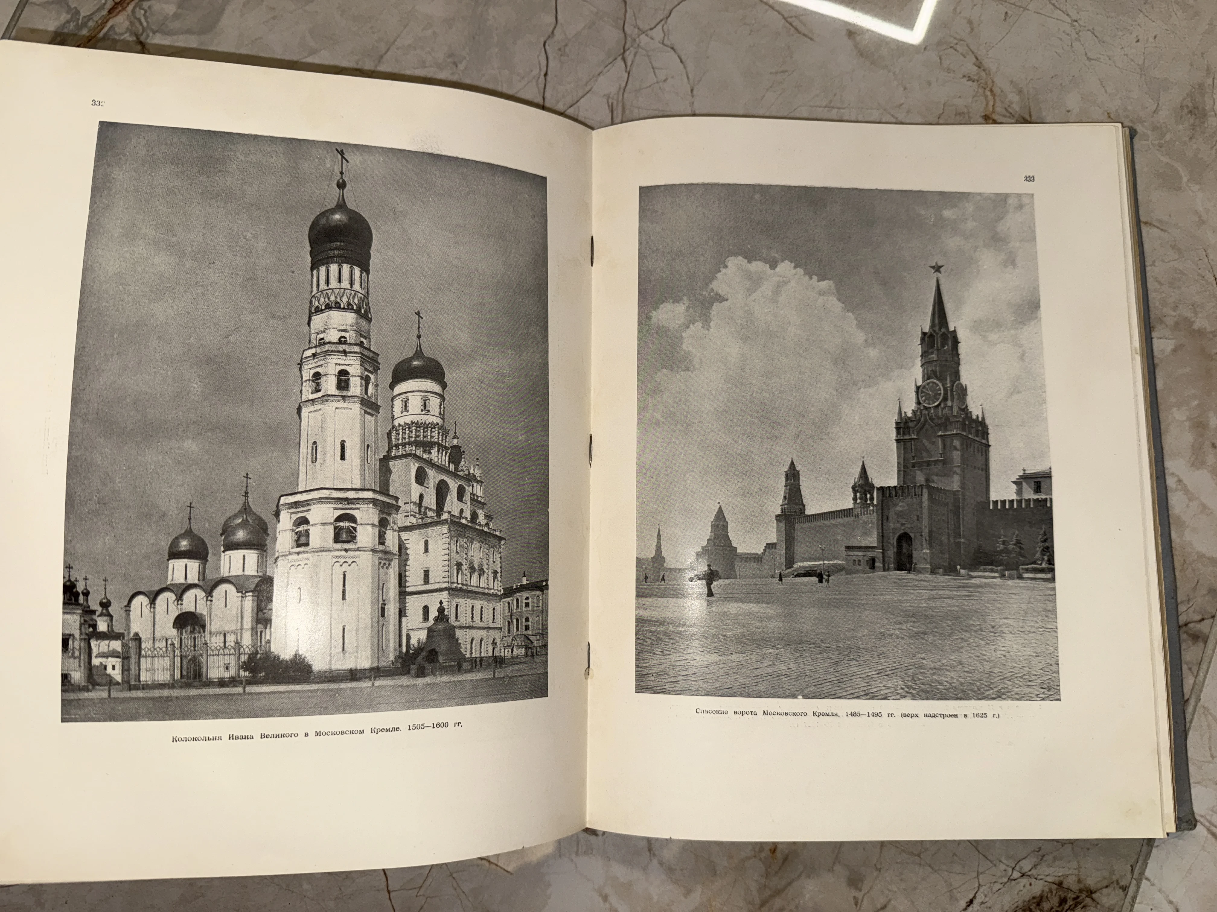 Разворот антикварной книги с черно-белыми фотографиями Колокольни Ивана Великого и Спасских ворот Московского Кремля.