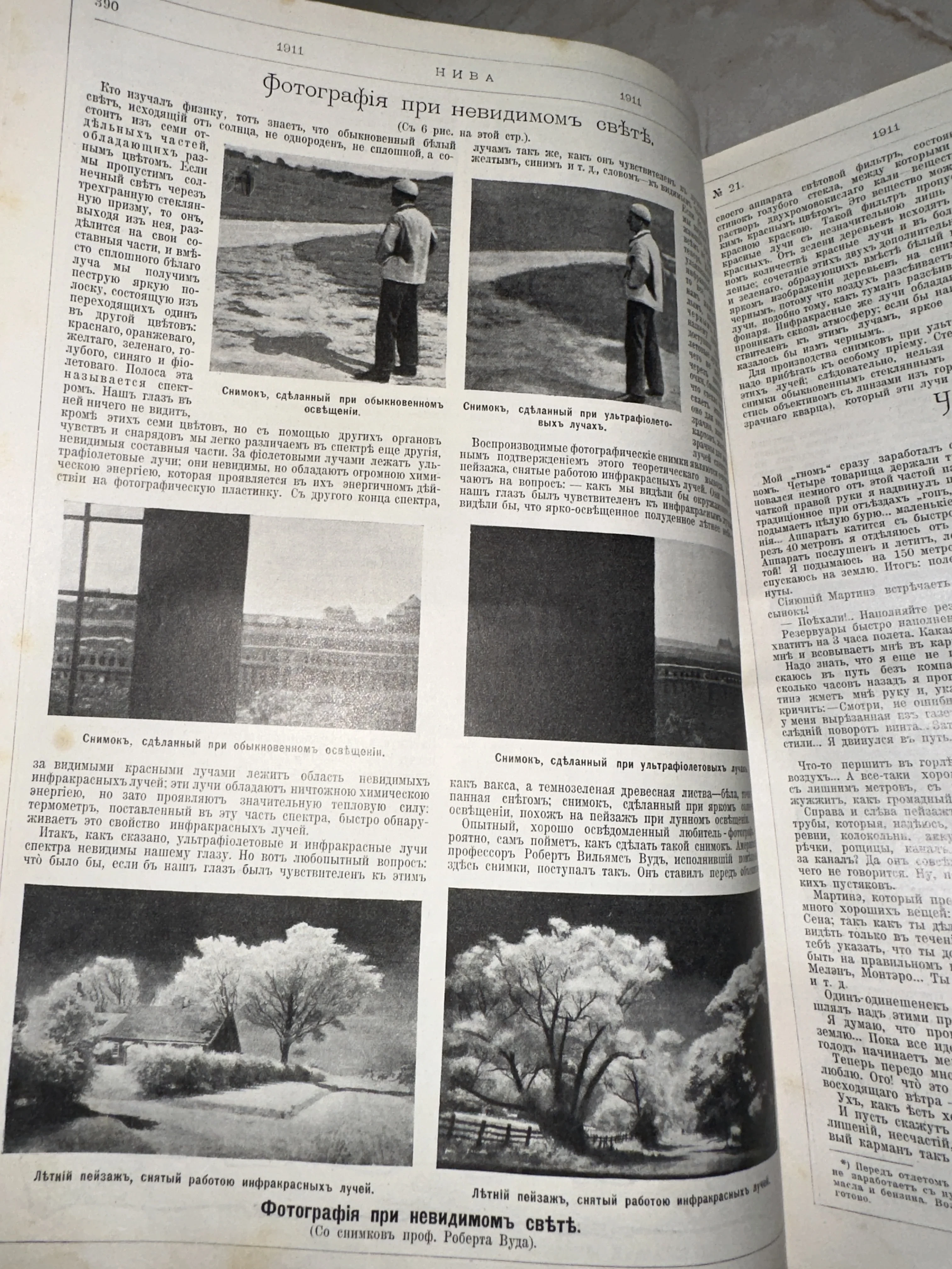 Разворот дореволюционного журнала «Нива» со статьей о фотографии в ультрафиолетовых и инфракрасных лучах с примерами сравнительных снимков.