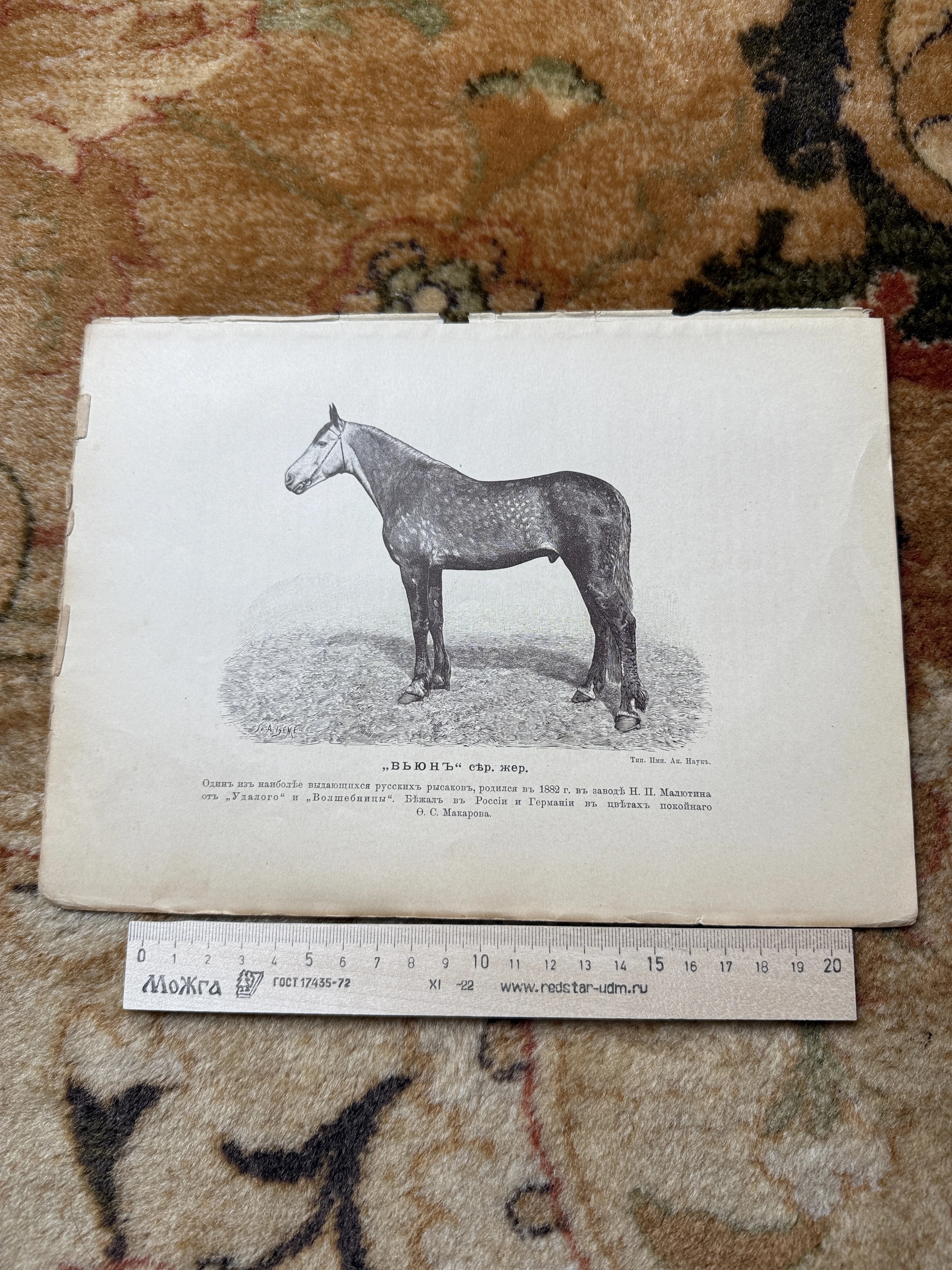 Изящная литография конца XIX века, извлеченная из редкого иппологического издания, представляет знаменитого серого жеребца Вьюна. Тонкая работа гравера передает великолепную стать и мускулатуру одного из лучших русских рысаков своего времени. Лист сохранил аутентичную патину эпохи и четкий типографский оттиск Императорской Академии наук, что делает его ценным приобретением для тематической коллекции.