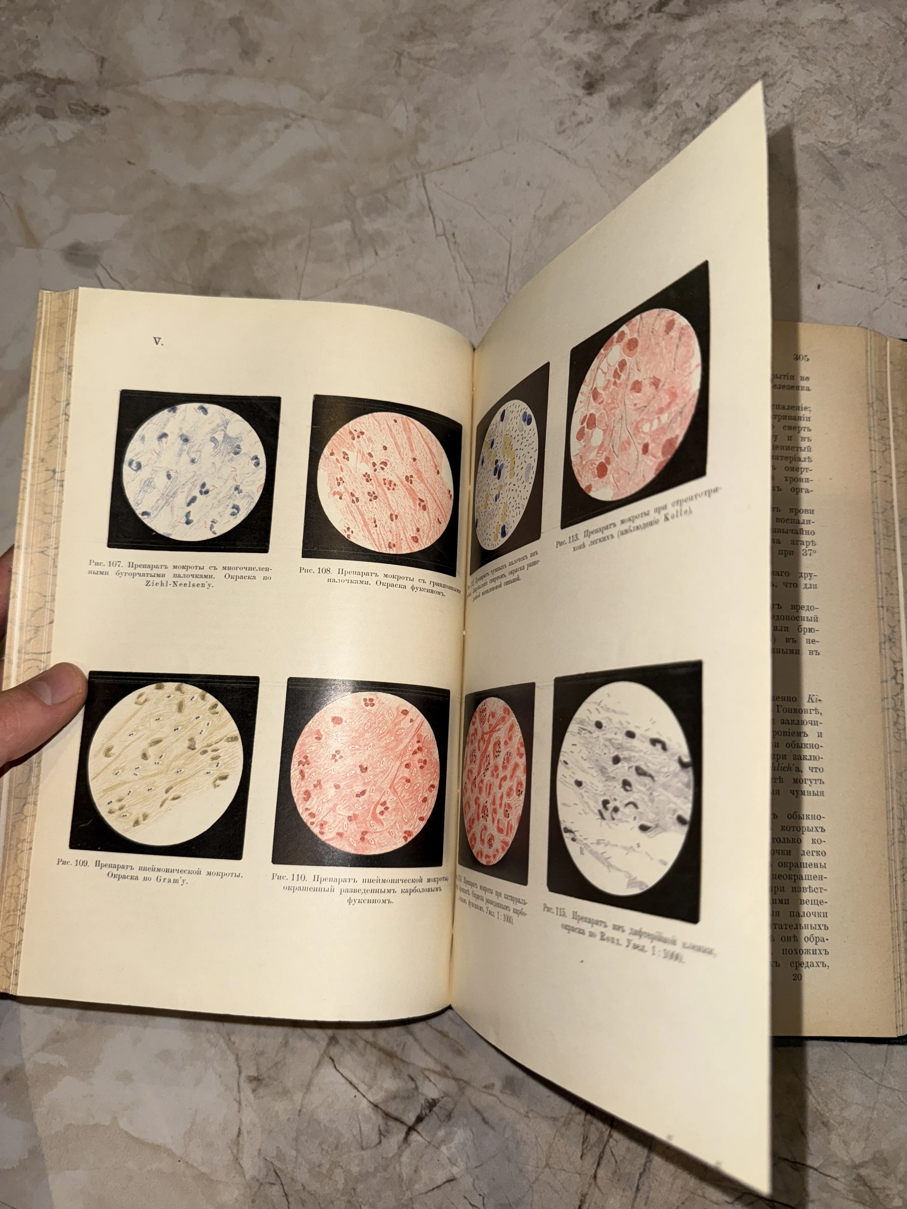Уникальный образец научной литературы начала XX века с детальными цветными литографиями микроскопических исследований. Страницы сохранили благородную патину времени, а четкость дореволюционной печати позволяет детально изучить методы окраски препаратов, такие как метод Циля-Нильсена и Грама. Это издание станет жемчужиной коллекции для ценителей истории медицины и старинной типографики.