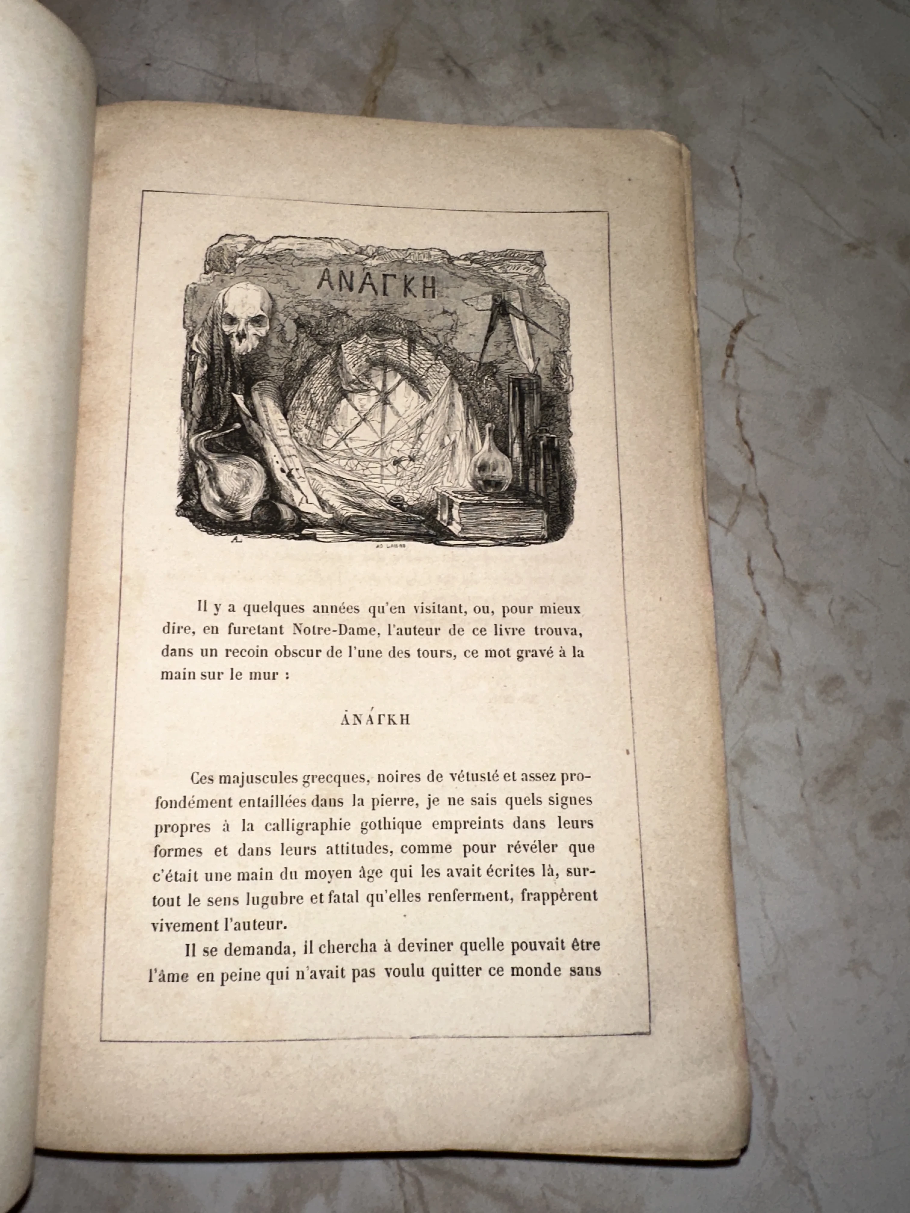 Страница старинной французской книги с гравированным изображением черепа, паутины и греческого слова ΑΝΑΓΚΗ в каменной нише.