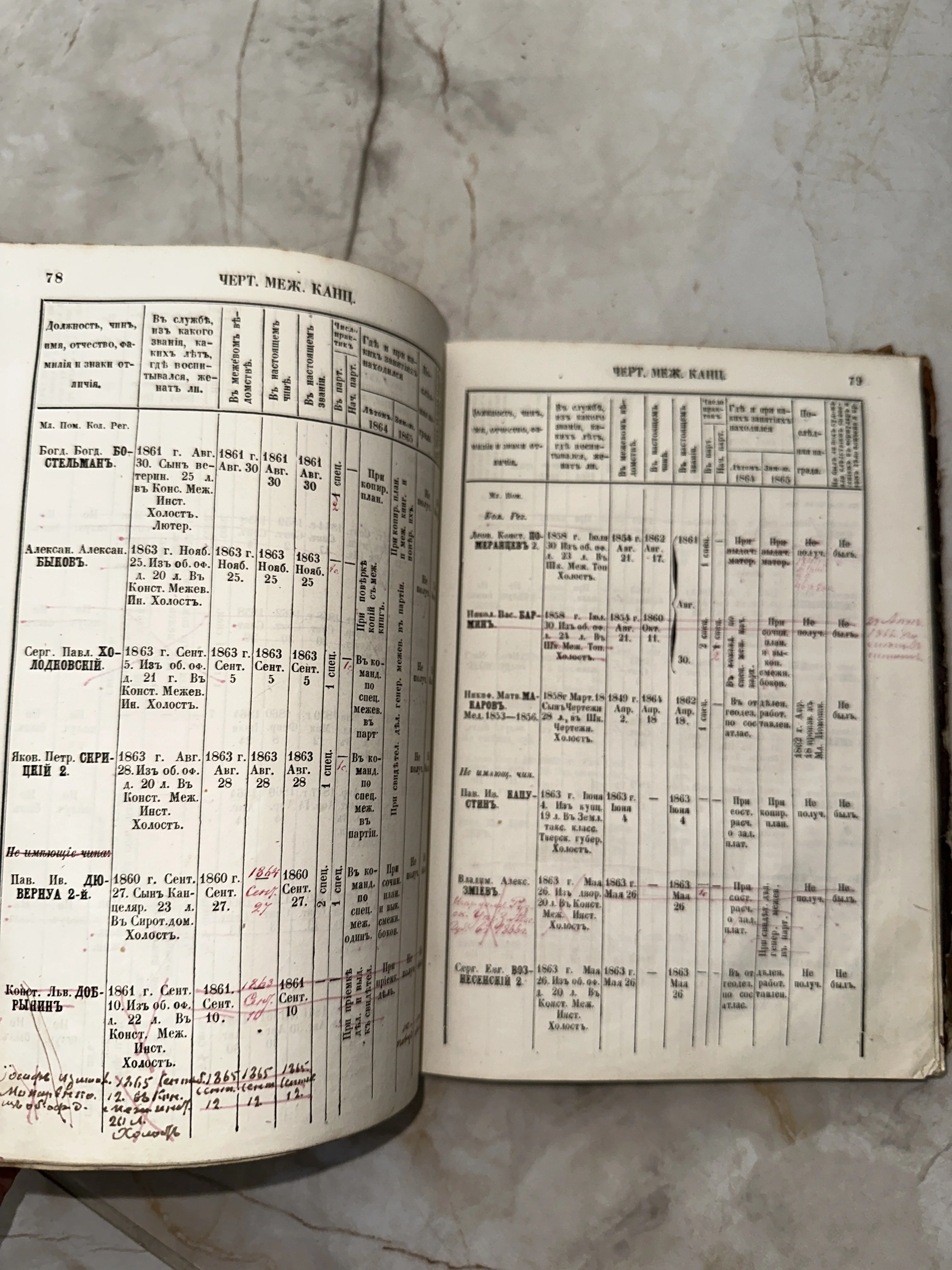 Перед вами подлинный документ эпохи: разворот с подробными таблицами государственных служащих середины XIX века. Особый интерес представляют аутентичные рукописные пометки и следы времени на пожелтевших страницах, которые придают книге неповторимый характер. Этот предмет станет ценным дополнением к коллекции старинных документов или уникальным подарком для историка.