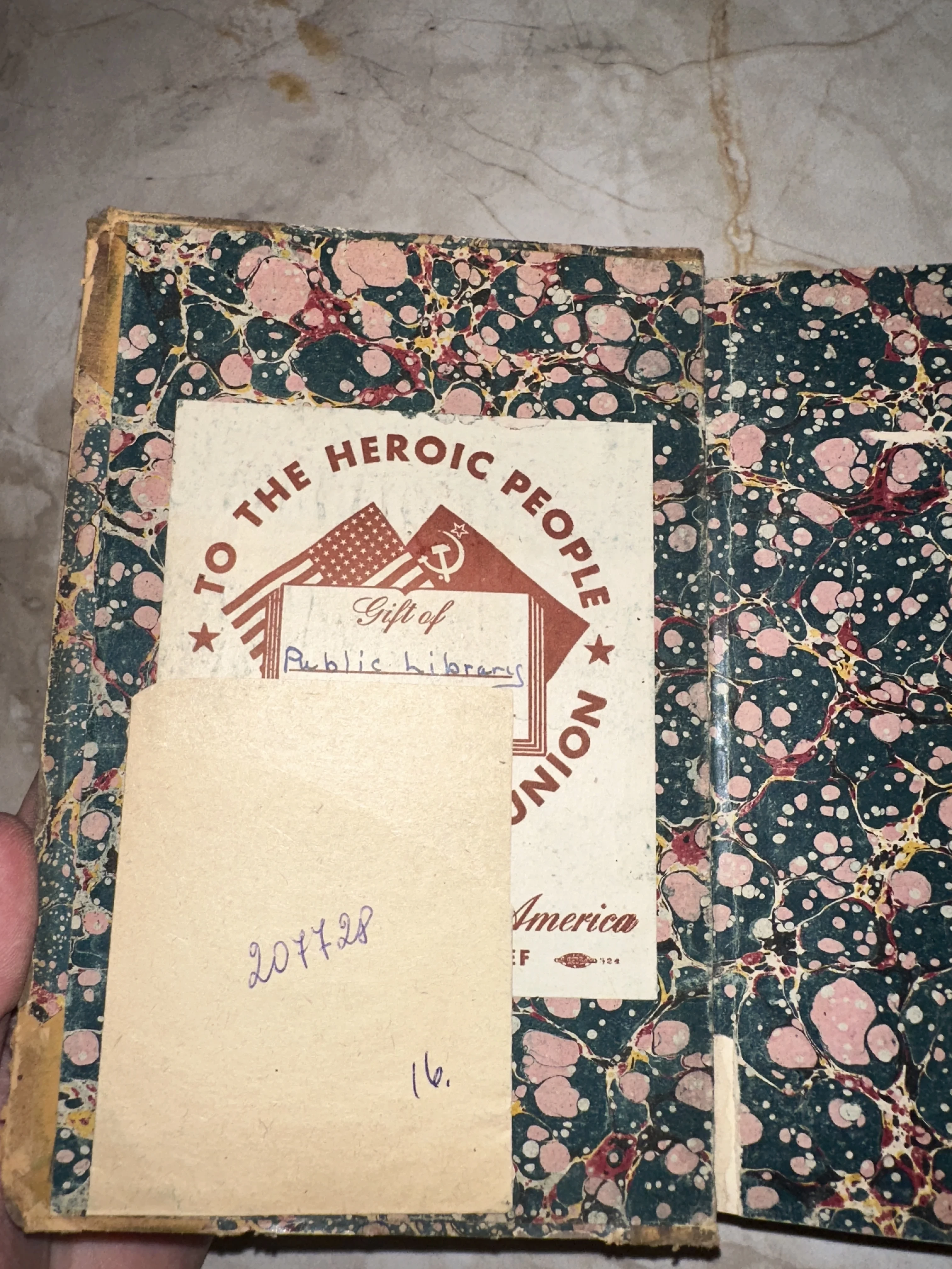 Уникальный артефакт эпохи Второй мировой войны: книга с дарственным ярлыком, свидетельствующим о поддержке советского народа со стороны США. Изящный мраморный форзац и сохранившийся библиотечный вкладыш с рукописными номерами создают неповторимую атмосферу живой истории и подчеркивают коллекционную ценность экземпляра.