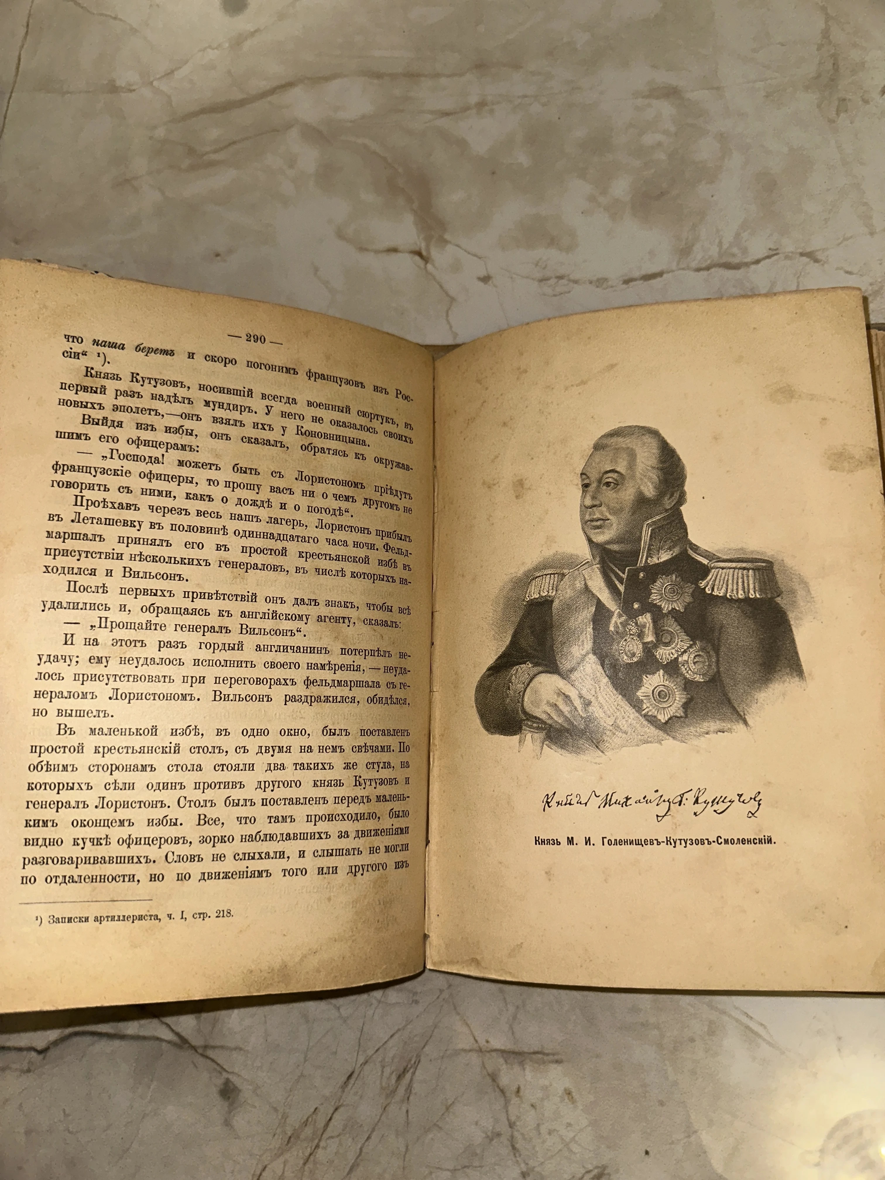 Великолепный образец исторического книгоиздания с литографированным портретом князя Кутузова-Смоленского. Текст на благородно пожелтевших страницах, напечатанный в дореволюционной орфографии, повествует о судьбоносных моментах войны 1812 года. Издание обладает высокой коллекционной ценностью и передает неповторимую атмосферу ушедшей эпохи.
