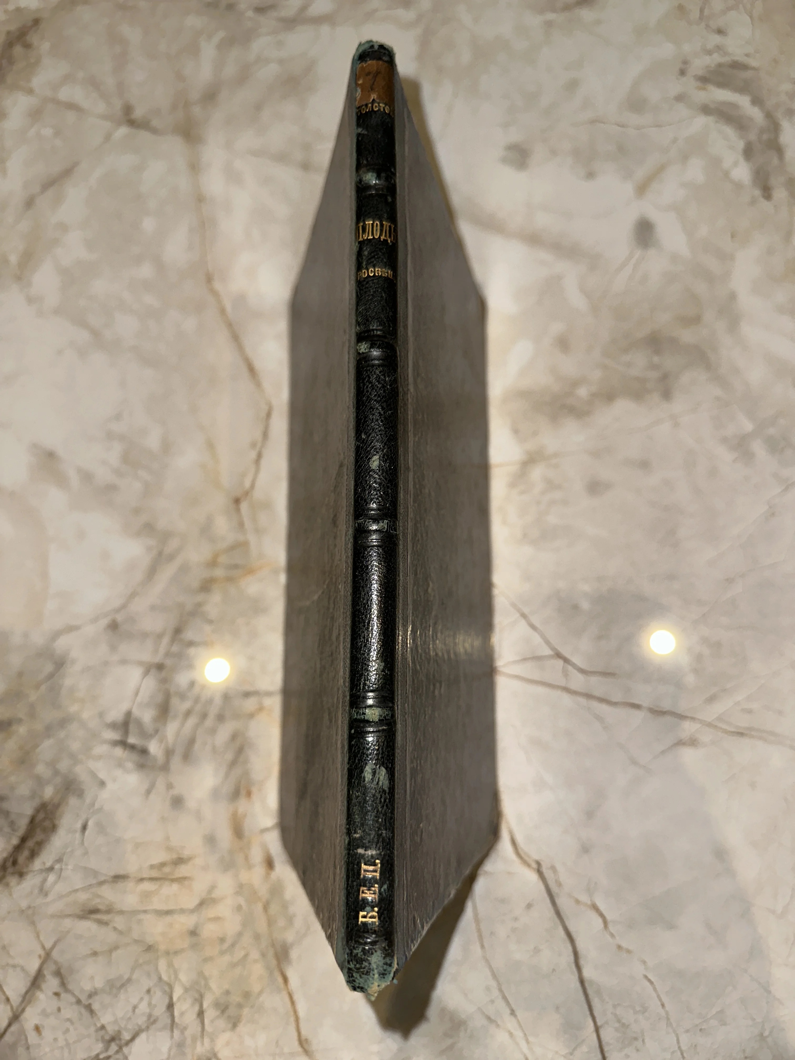 Элегантный кожаный корешок с классическими бинтами и золотым тиснением представляет собой образец книжного искусства прошлого столетия. Благородная патина и естественные потертости подчеркивают почтенный возраст и подлинность этого экземпляра. Издание «Плодов просвещения» великого классика станет жемчужиной в собрании любого библиофила.
