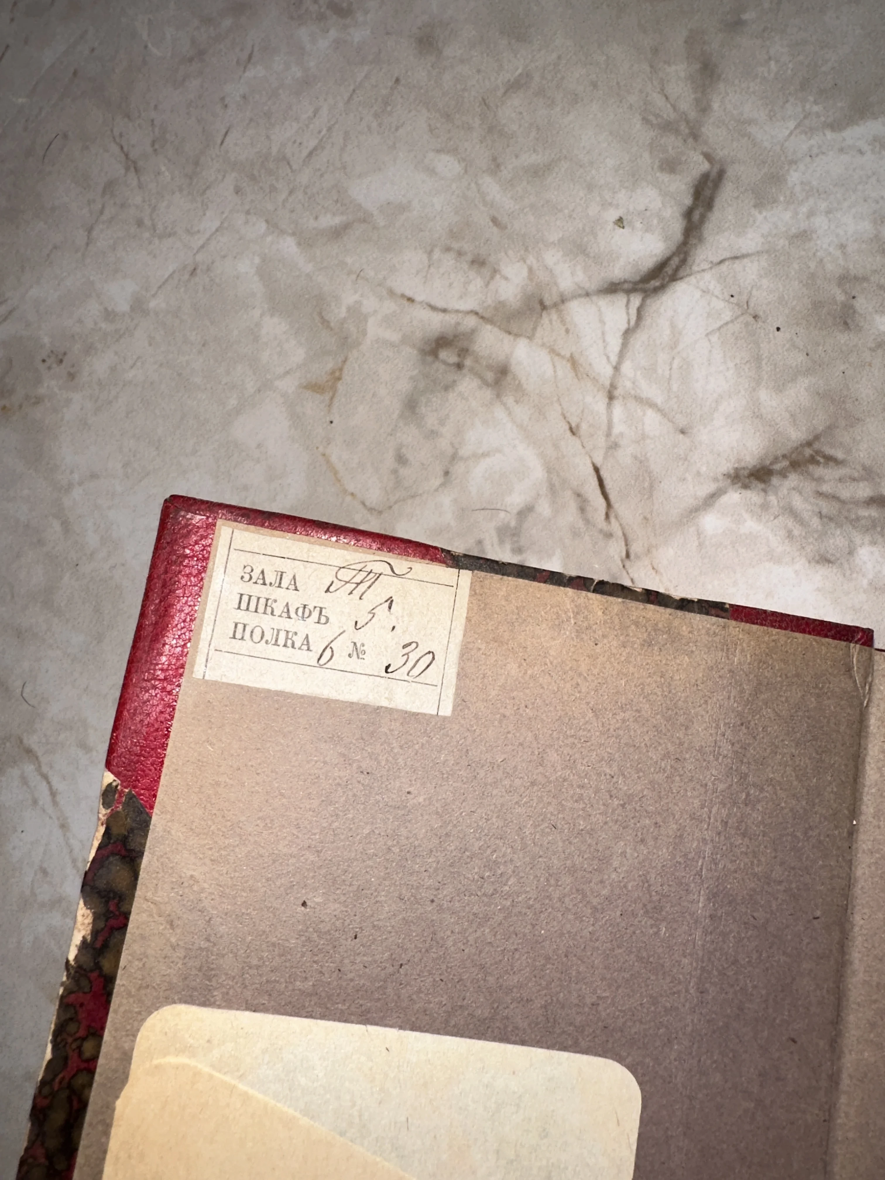 Этот уникальный фрагмент истории переносит нас в частные книжные собрания дореволюционной России. Тщательно заполненный от руки ярлык свидетельствует о строгом порядке в домашней библиотеке, а сочетание красной кожи и благородной патины времени на бумаге придает предмету особый антикварный шарм.