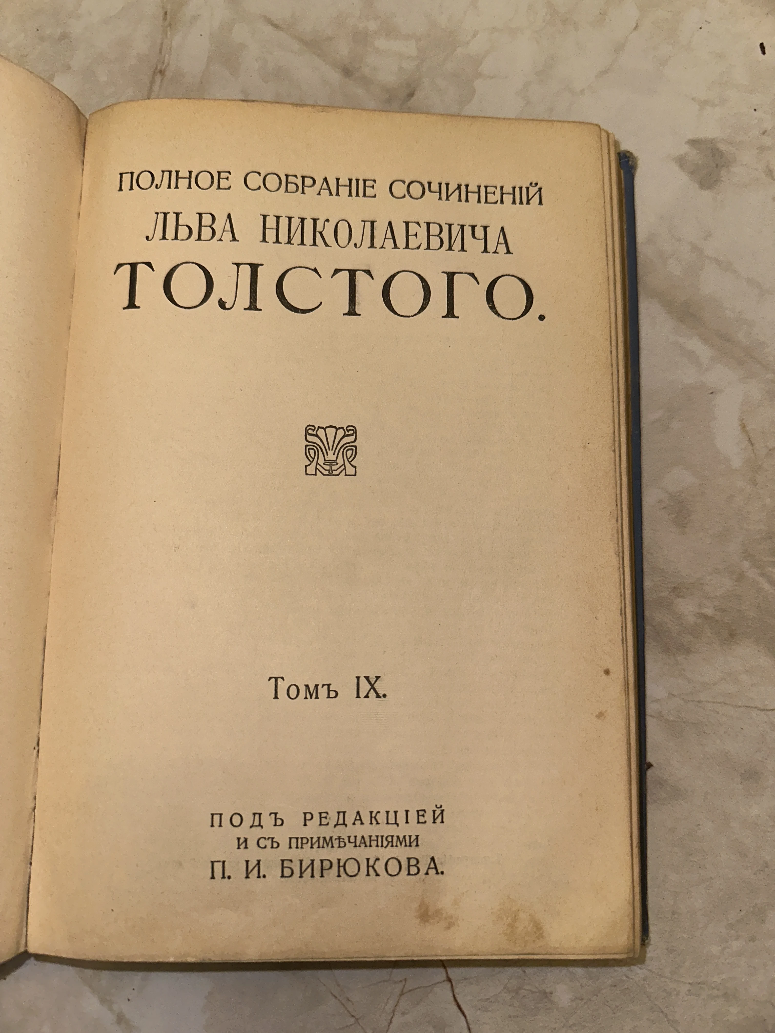 Перед вами подлинный образец книгоиздательского дела начала XX века — титульный лист девятого тома из собрания сочинений великого классика в дореволюционной орфографии. Благородная патина на страницах и строгая типографика подчеркивают коллекционную ценность издания, подготовленного под редакцией биографа писателя П. И. Бирюкова.