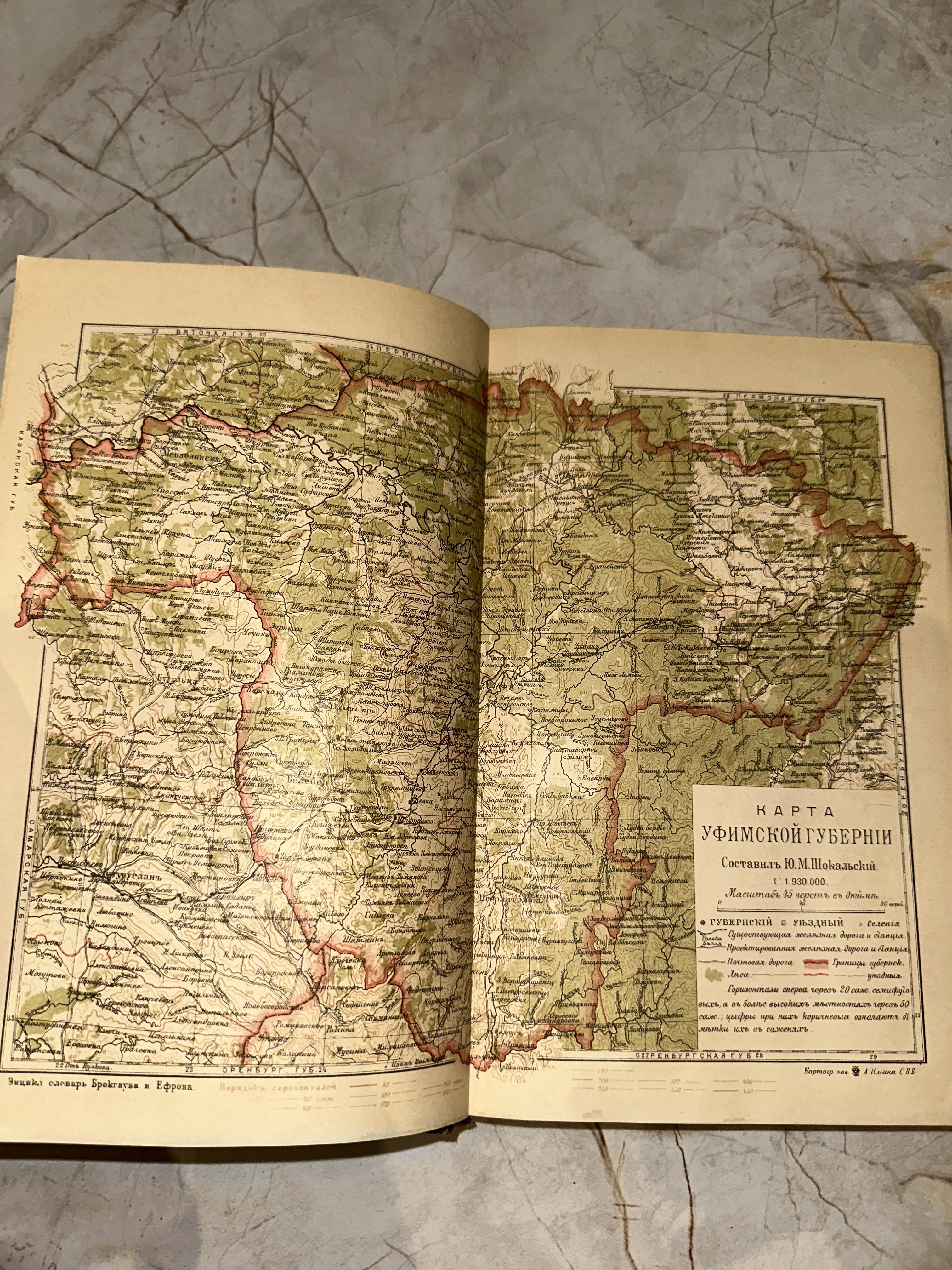 Разворот старинной книги с цветной литографированной картой Уфимской губернии из словаря Брокгауза и Ефрона.
