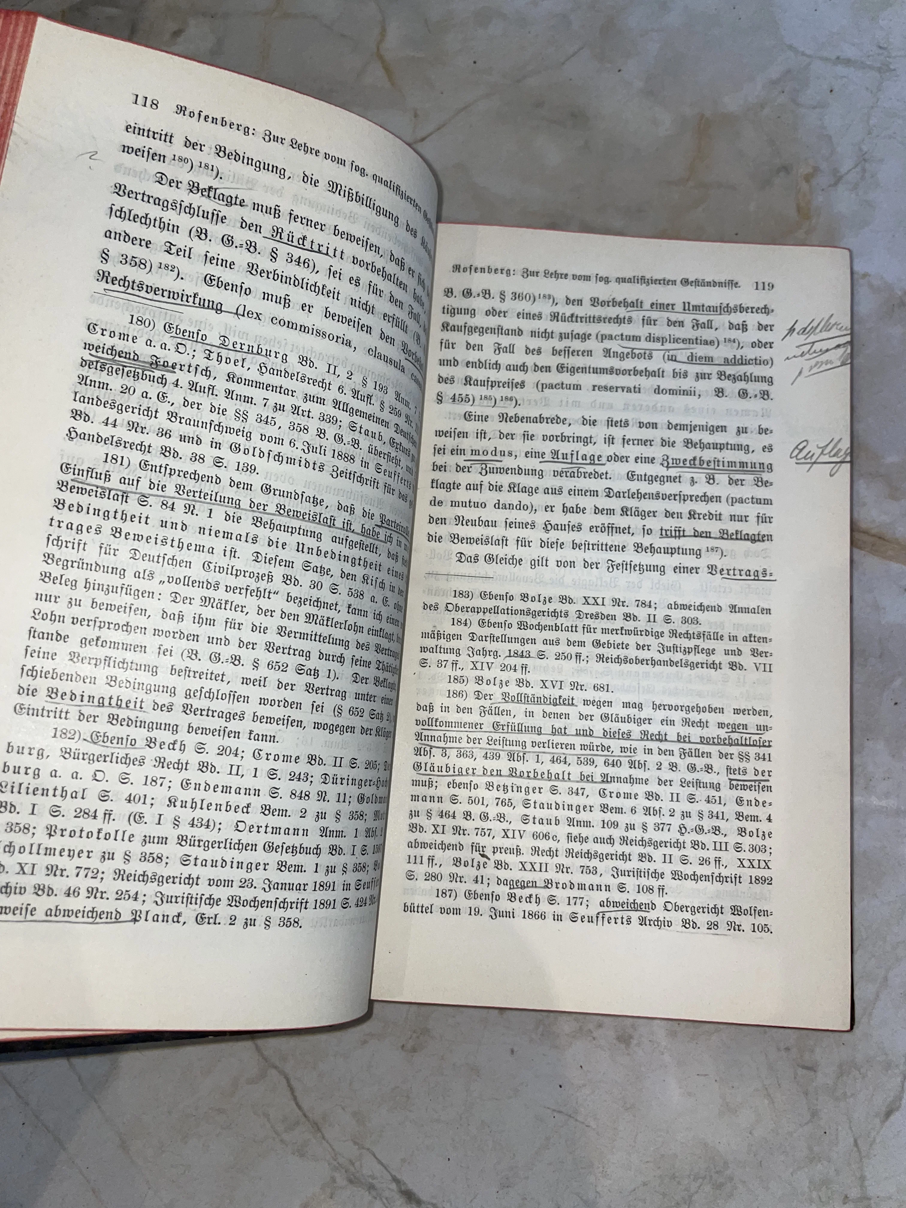 Этот редкий экземпляр правового трактата конца XIX века наглядно демонстрирует эстетику классической немецкой типографики. Особый шарм предмету придают аутентичные рукописные комментарии на полях (маргиналии), превращающие книгу в уникальный исторический документ. Благородное пожелтение бумаги и четкая сохранность шрифта создают атмосферу старинной частной библиотеки.