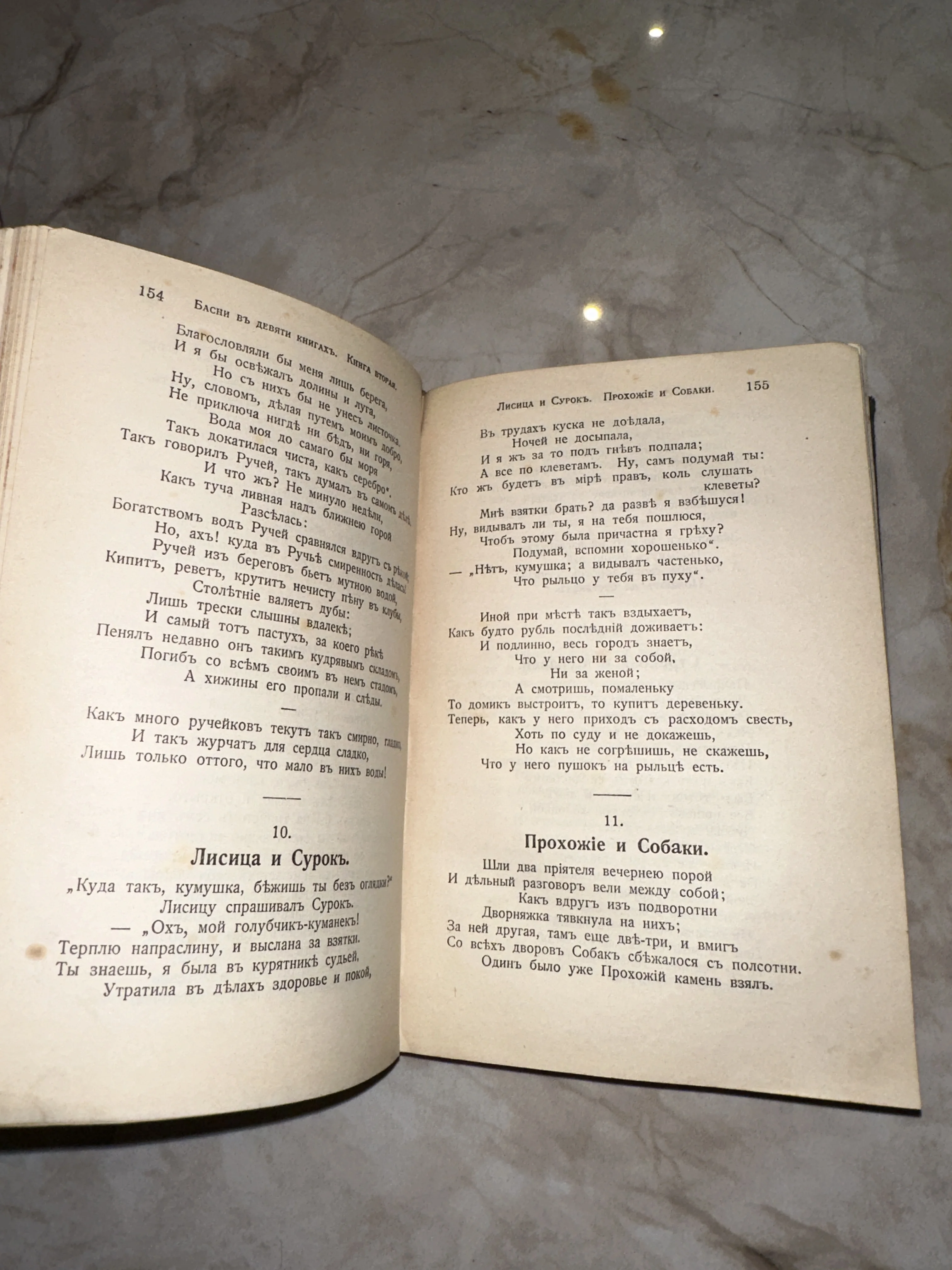 Изящный разворот антикварного сборника басен, напечатанный в классической дореволюционной орфографии. Пожелтевшие от времени страницы с легкой патиной и четкий антиквенный шрифт передают неповторимую атмосферу книгоиздания конца XIX — начала XX века. Этот экземпляр станет жемчужиной в коллекции любителя русской классики и старинной полиграфии.