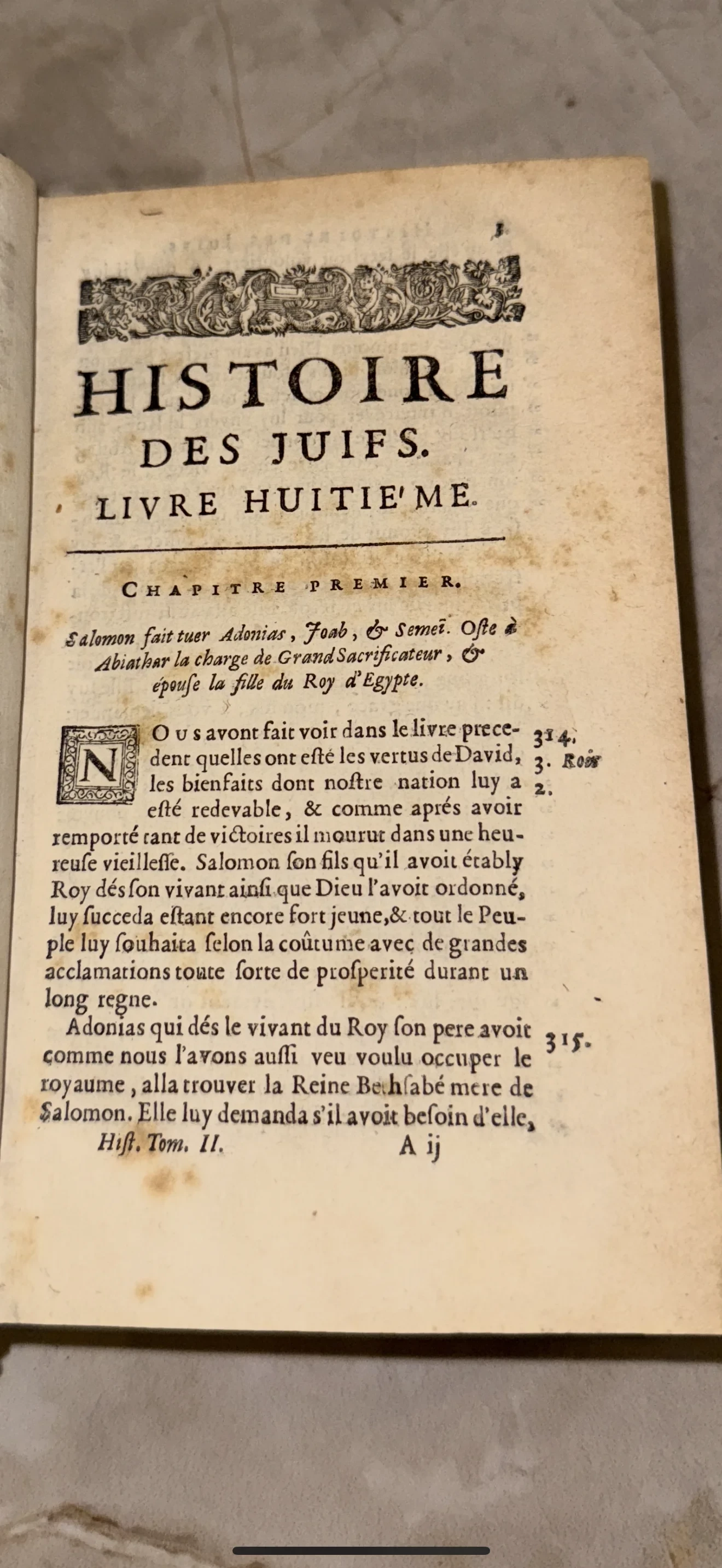 Этот редкий лист из старинного издания «Истории иудеев» демонстрирует великолепие типографского искусства прошлых столетий. Изящная барочная виньетка, характерная верстка с использованием литеры «f» вместо «s» и благородная патина времени на бумаге создают неповторимую атмосферу исторической подлинности. Превосходный образец для коллекционеров антикварной литературы и ценителей классической эстетики.