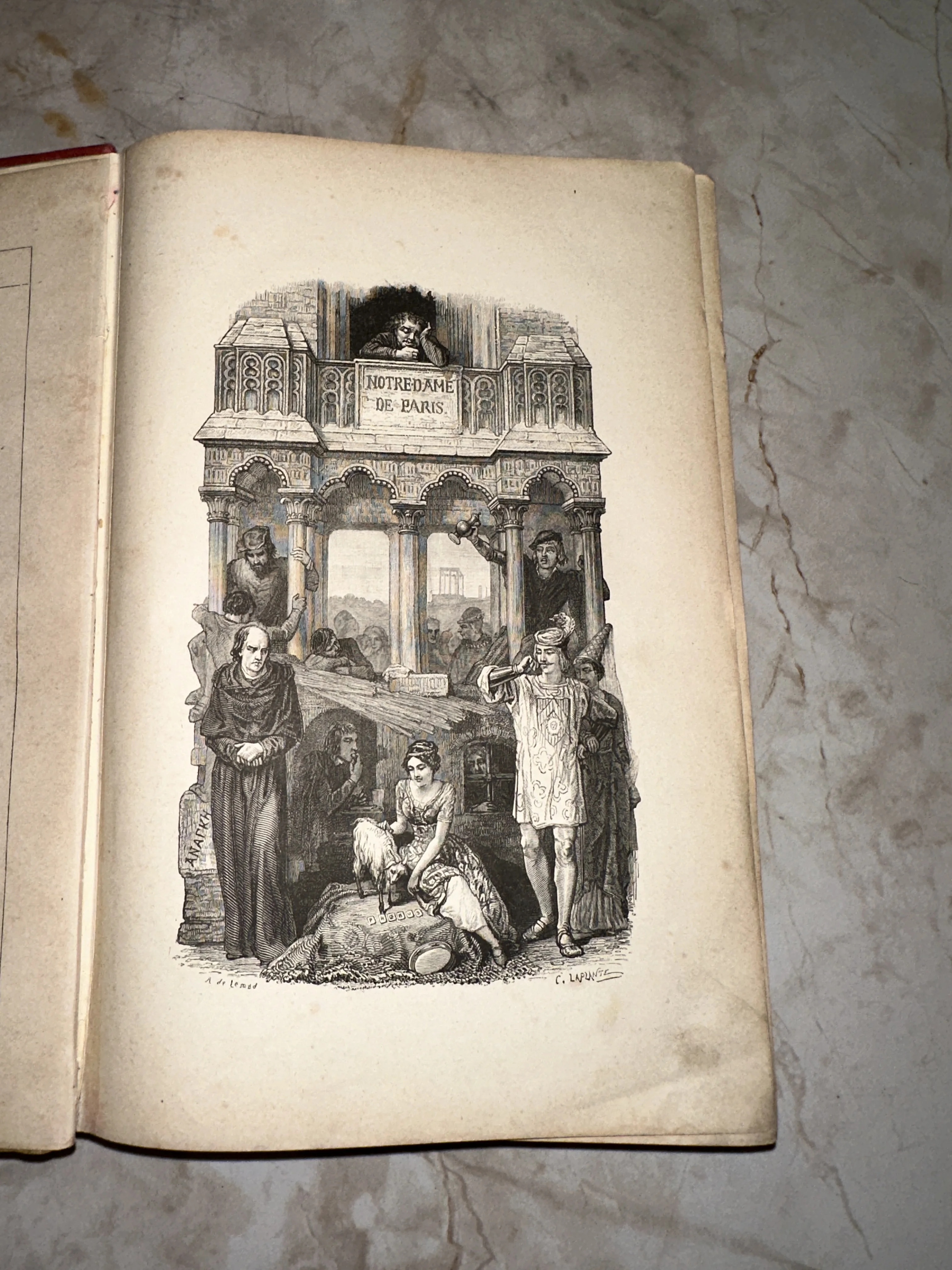 Великолепная фронтисписная иллюстрация XIX века, объединяющая ключевые образы шедевра Виктора Гюго. На детально проработанной гравюре художников Э. де Лемюда и Ш. Лапланта запечатлены Эсмеральда, Клод Фролло и взирающий с высоты собора Квазимодо. Пожелтевшие от времени страницы и благородная патина придают этому изданию особую историческую и коллекционную ценность.