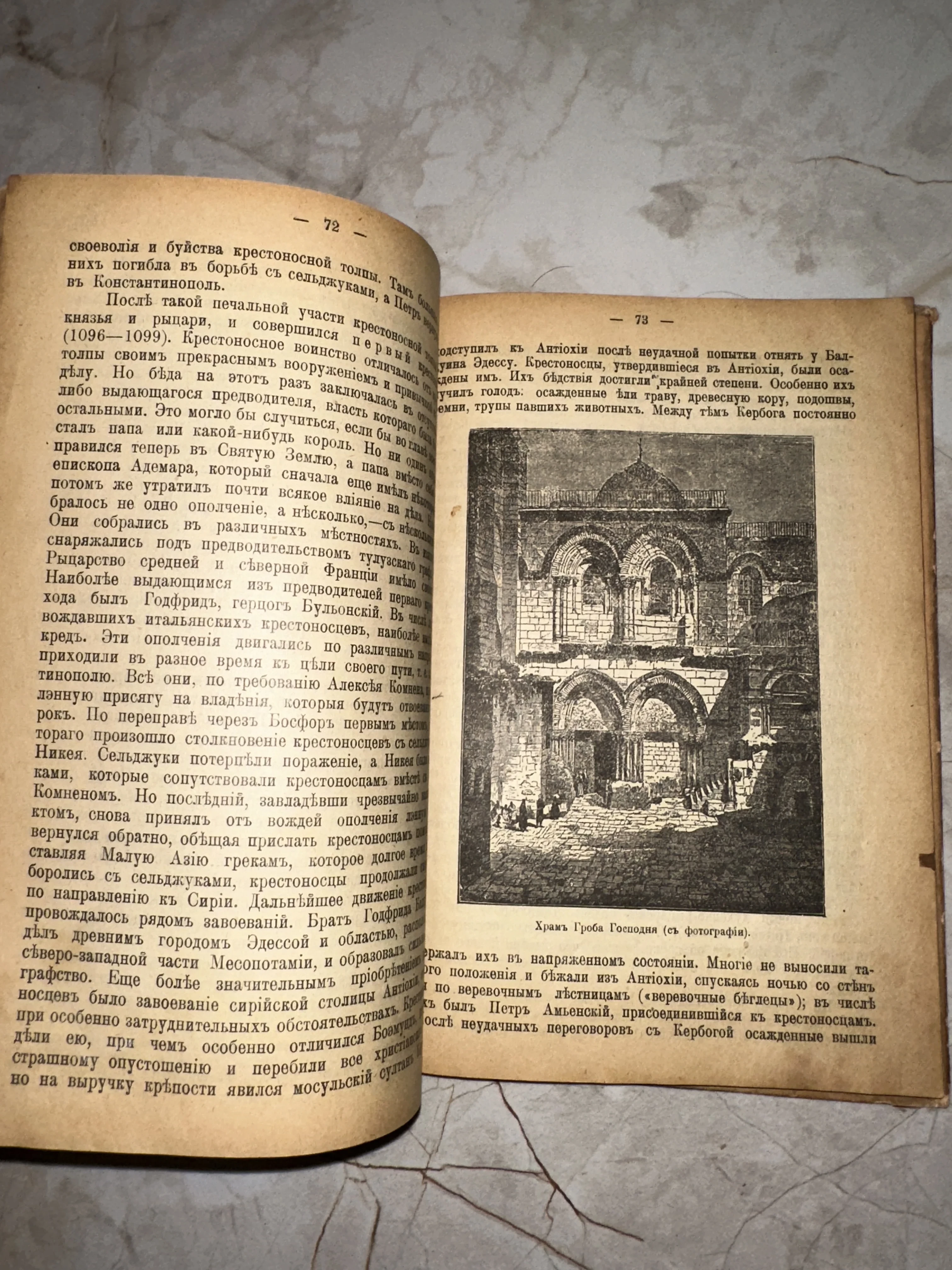 Этот редкий экземпляр погружает в эпоху Первого крестового похода, описанного на страницах с благородной патиной времени и дореволюционной орфографией. На развороте представлена детальная гравюрная иллюстрация Храма Гроба Господня, выполненная по старинному фотоснимку. Прекрасный образец исторического книгопечатания, сохранивший дух и атмосферу конца XIX столетия.