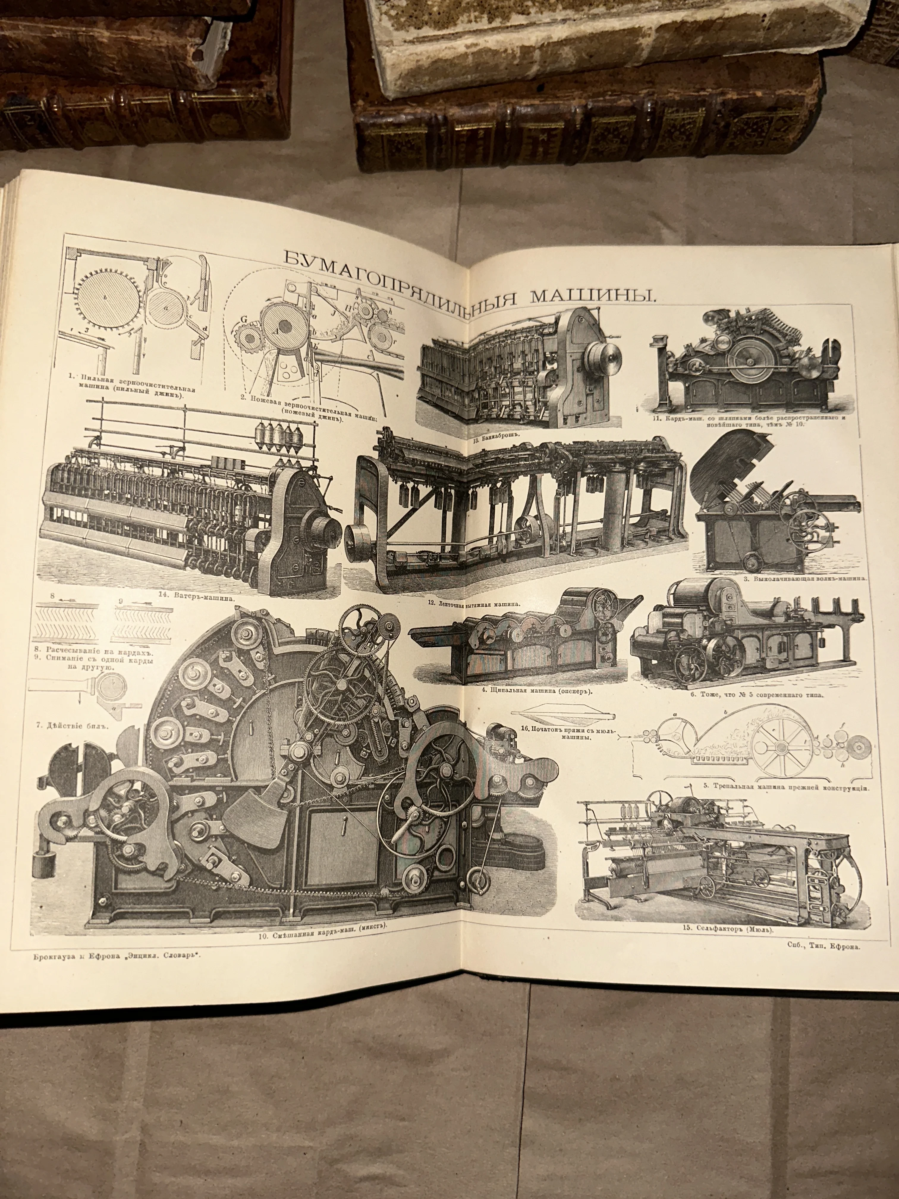 Уникальный образец технической графики из легендарного энциклопедического словаря Брокгауза и Ефрона, запечатлевший мощь промышленной революции. Детальные изображения бумагопрядильных машин выполнены с поразительной точностью, а благородное пожелтение бумаги лишь подчеркивает антикварную ценность издания. Этот разворот станет великолепным подарком для ценителей истории инженерии и коллекционеров старинных гравюр.