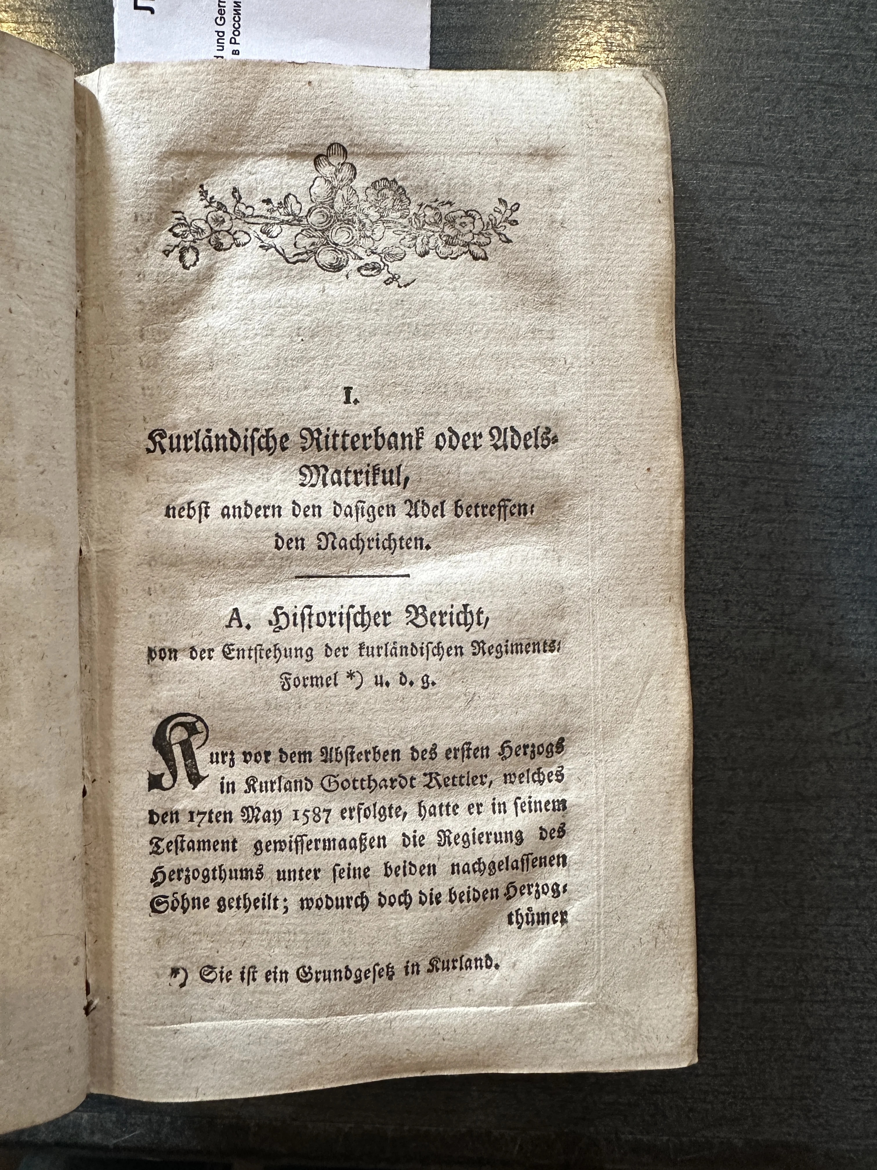 Разворот антикварной книги с готическим шрифтом на немецком языке, украшенный цветочной виньеткой сверху. Текст посвящен Курляндскому дворянскому матрикулу.