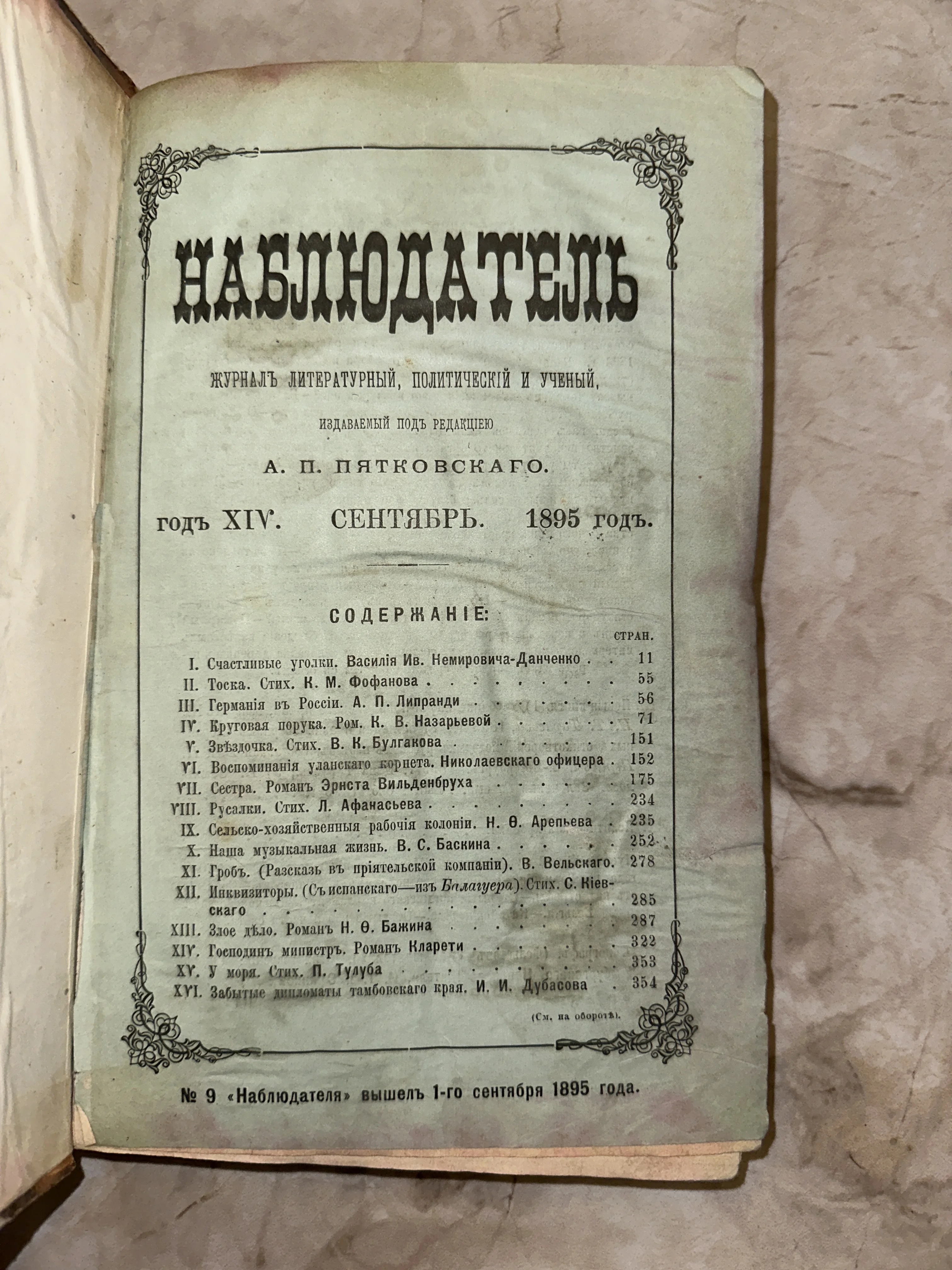 Титульная страница и оглавление антикварного журнала Наблюдатель за сентябрь 1895 года с дореволюционной орфографией.