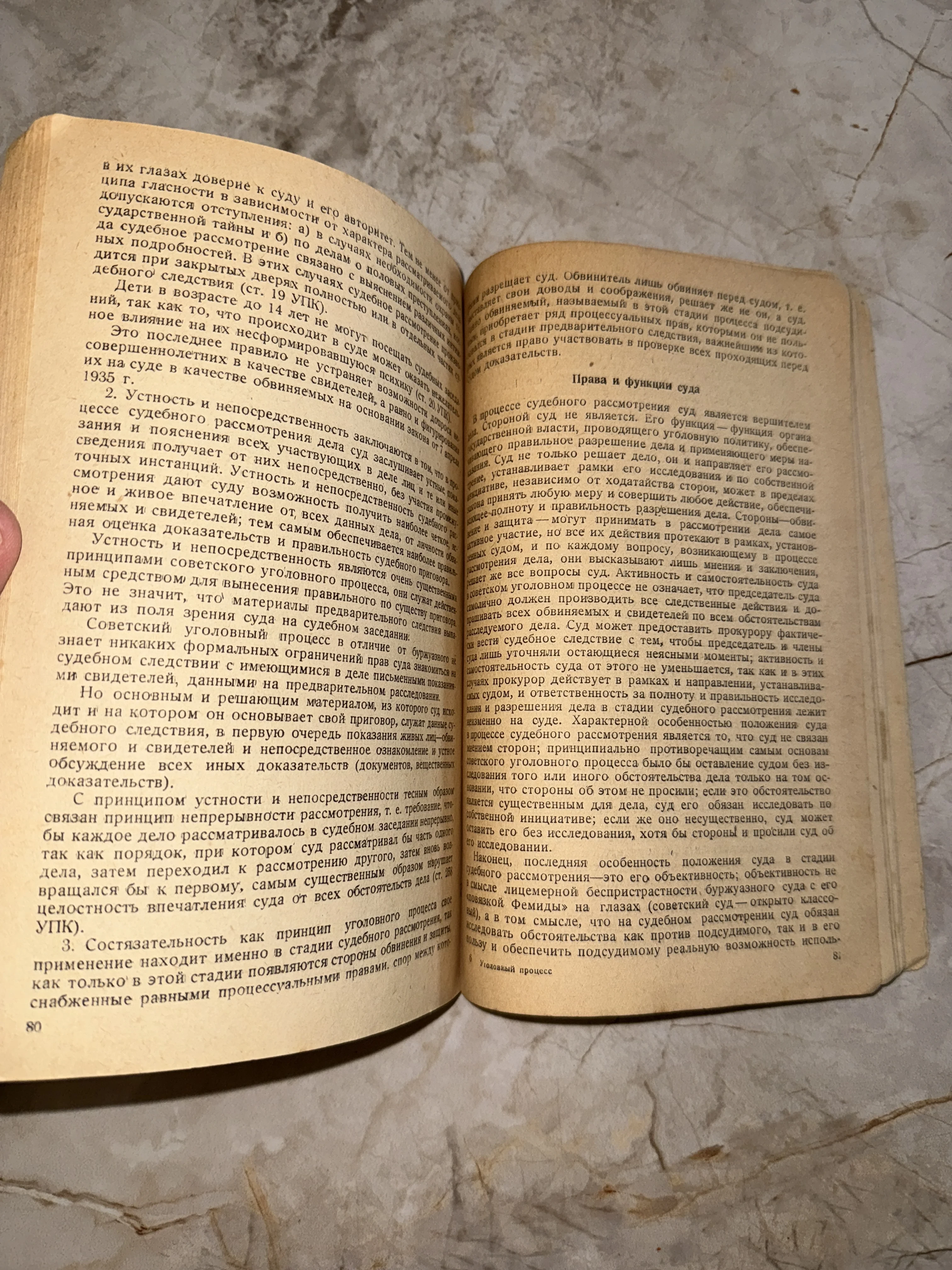 Перед вами редкий образец юридической литературы середины XX века, сохранивший атмосферу эпохи в своих пожелтевших страницах. Текст детально описывает принципы советского правосудия, а характерная типографика и естественная патина времени делают этот экземпляр ценным артефактом для историков и коллекционеров.