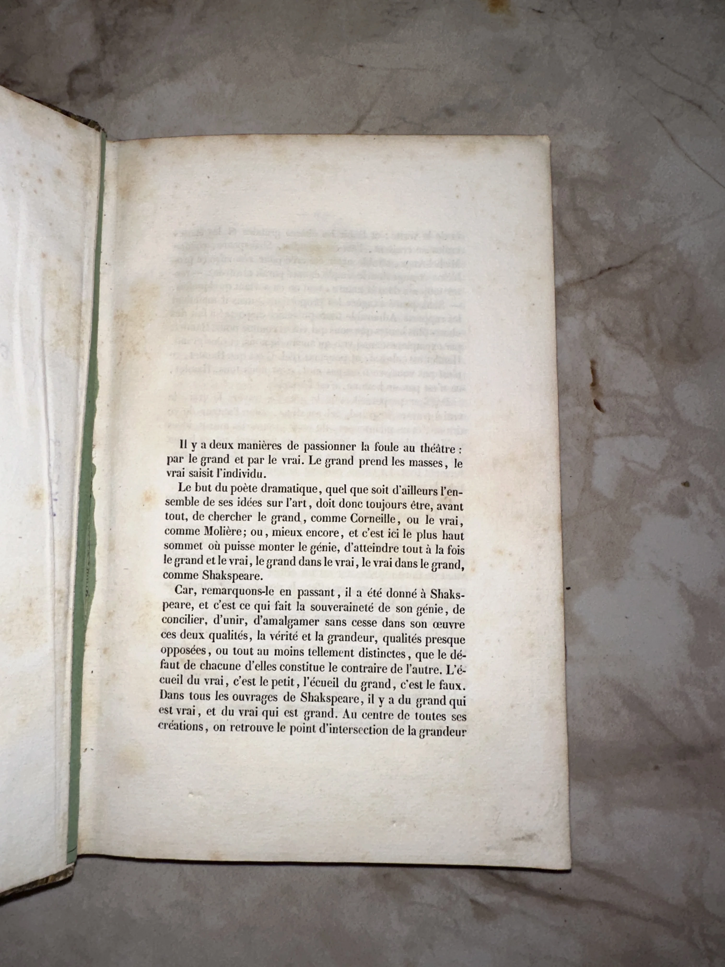 Разворот старинной книги на французском языке с рассуждениями о Шекспире и Мольере на пожелтевшей бумаге.