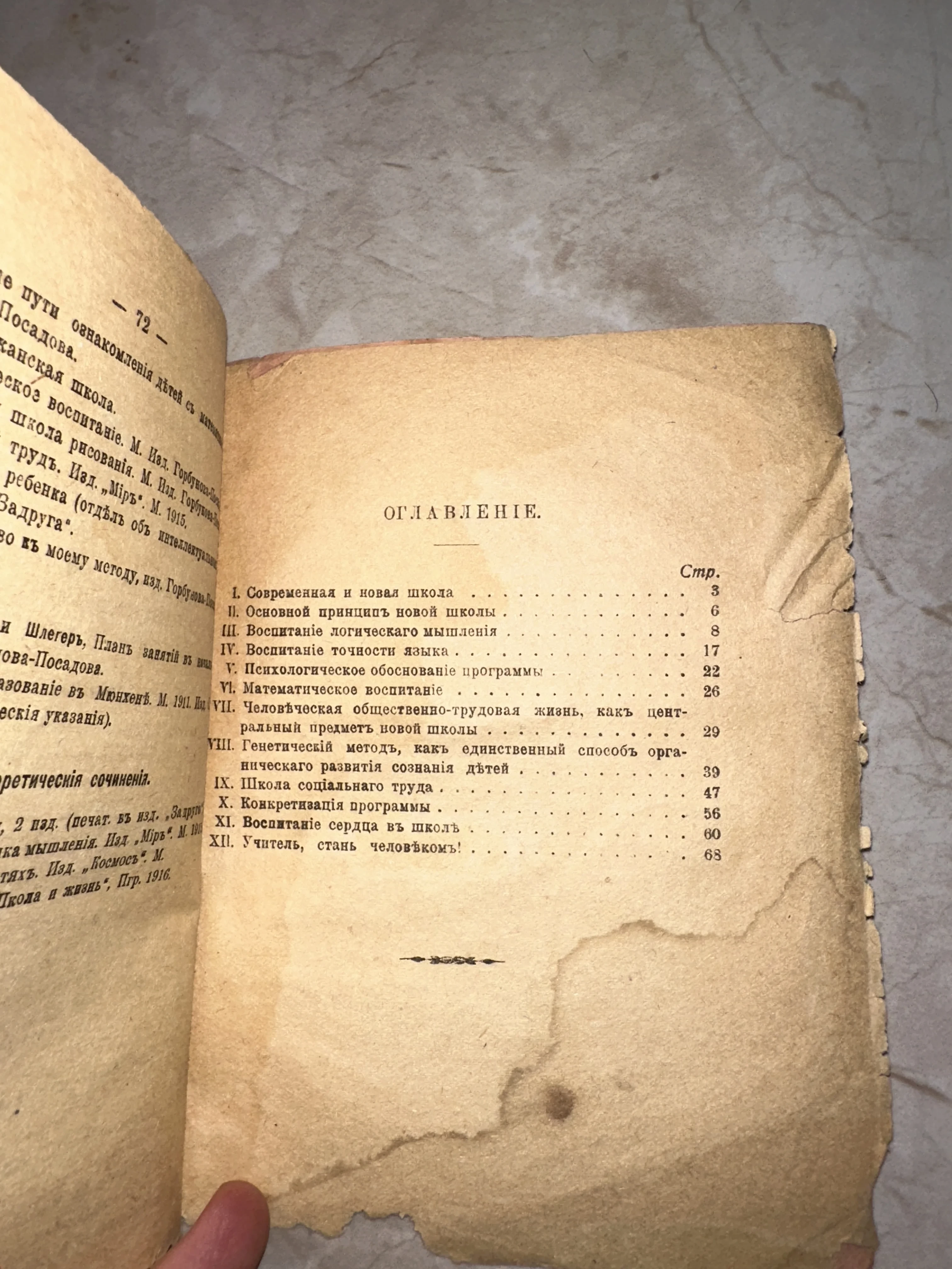 Оглавление антикварной книги по педагогике, начало XX века