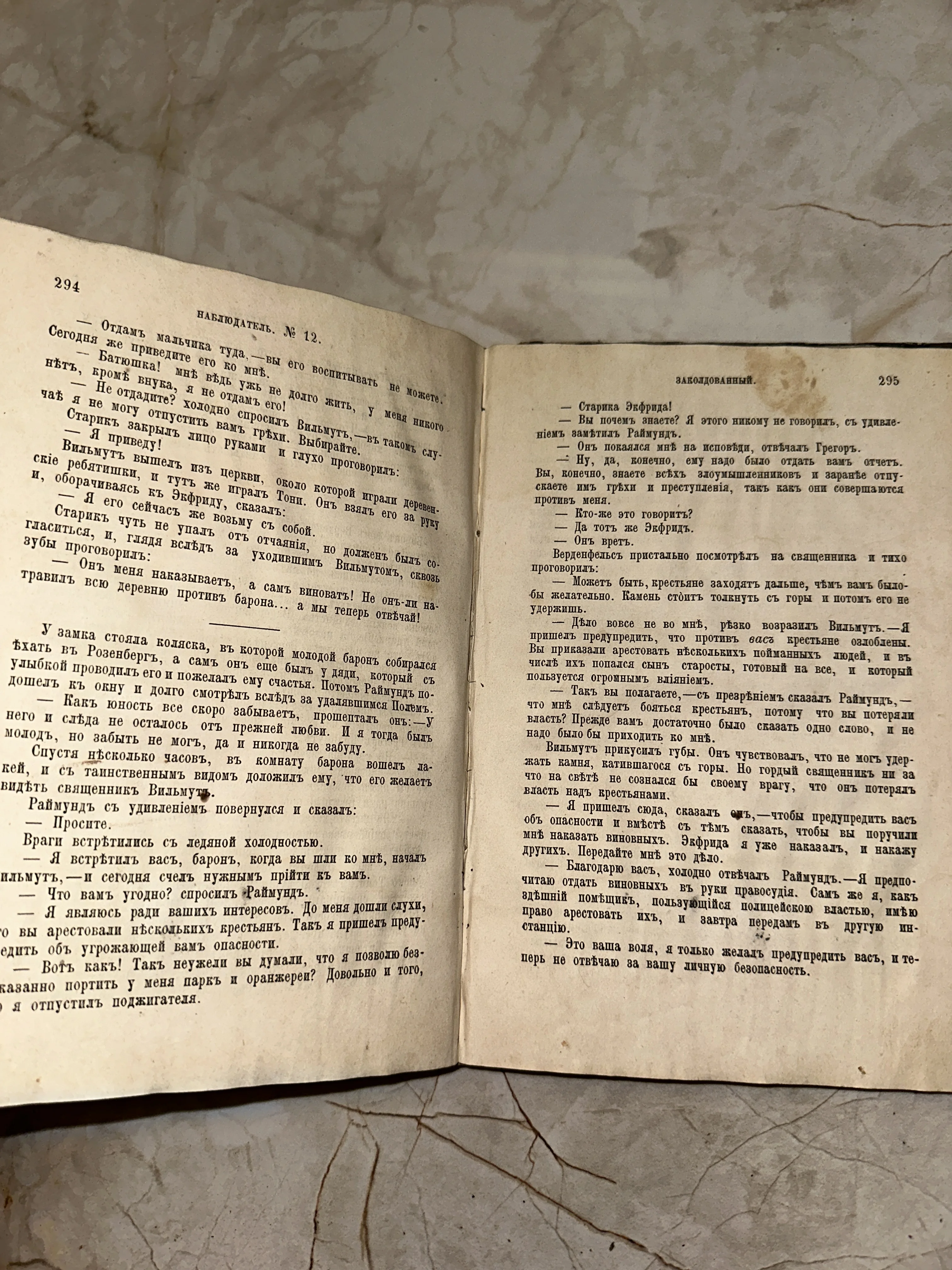 Этот аутентичный разворот из журнала «Наблюдатель» конца XIX века — живое свидетельство ушедшей эпохи, сохранившее очарование дореволюционной орфографии. Пожелтевшая от времени бумага с легкой патиной и четкий типографский шрифт передают строгую эстетику дореволюционной периодики. Идеальный экспонат для ценителей истории русской литературы и книжного коллекционирования.