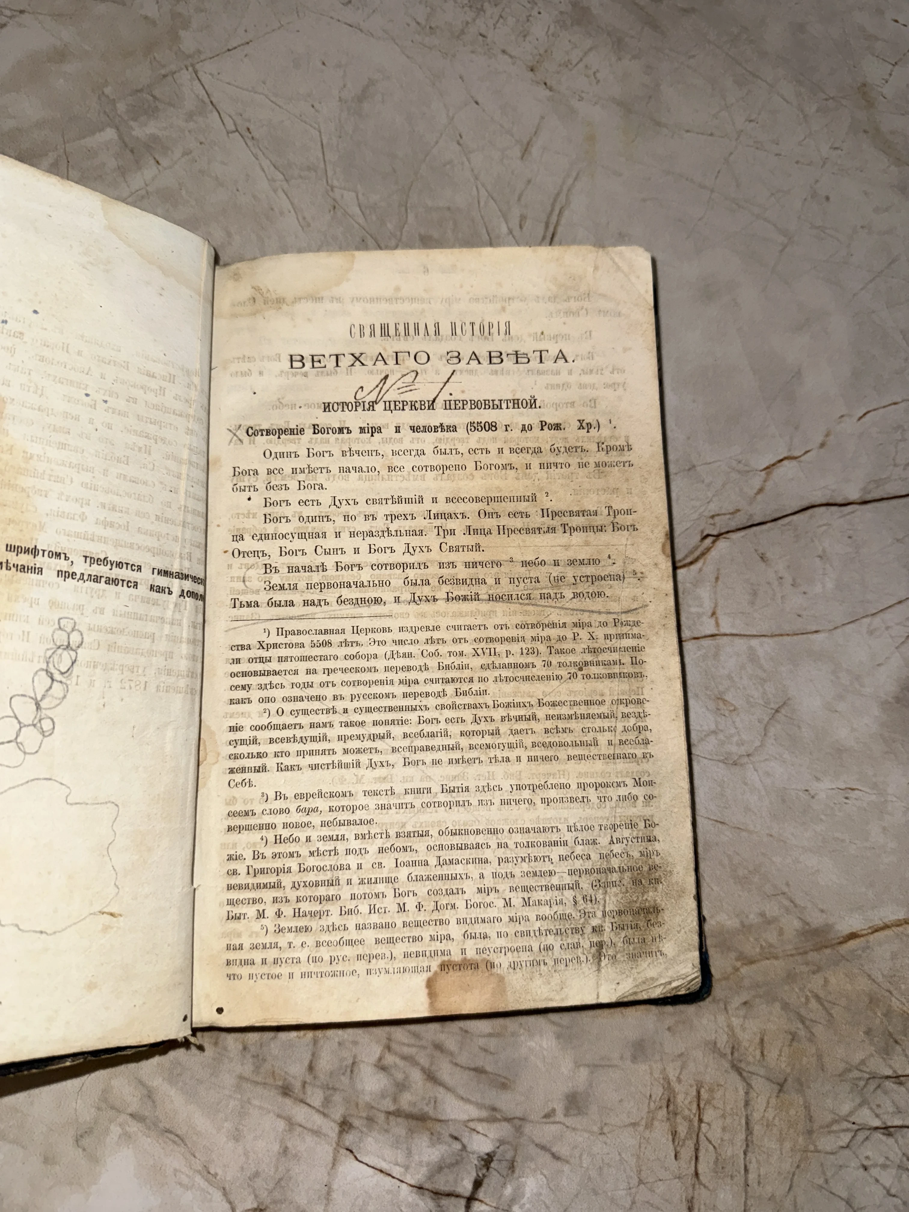 Разворот старинной книги на русском языке с заголовком Священная история Ветхого Завета и текстом о сотворении мира.
