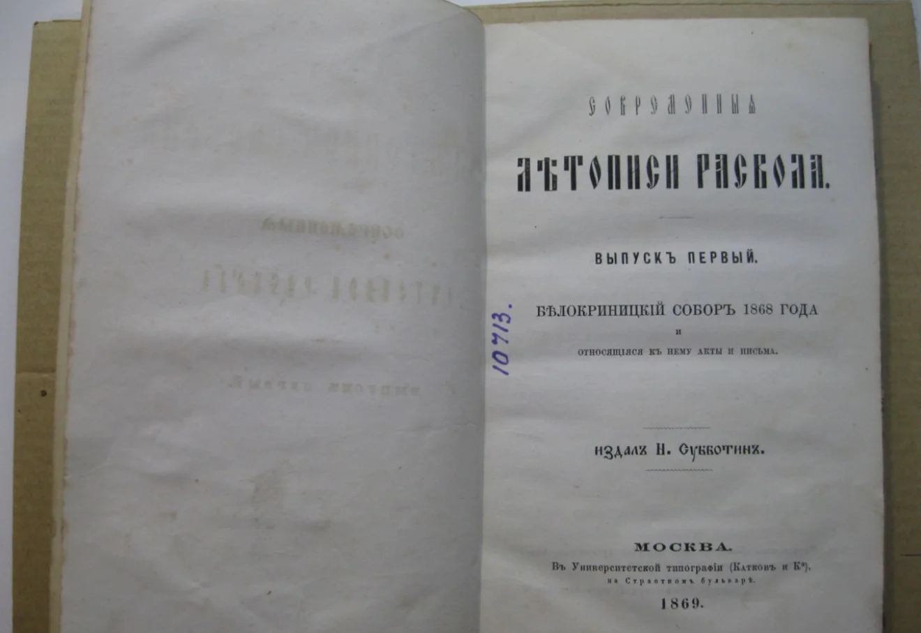 Фундаментальный труд профессора Н. И. Субботина, проливающий свет на события Белокриницкого собора 1868 года. Экземпляр на плотной бумаге с характерной патиной времени и архивными пометками представляет высокую историческую и библиографическую ценность. Издание отпечатано в знаменитой Университетской типографии Каткова на Страстном бульваре.