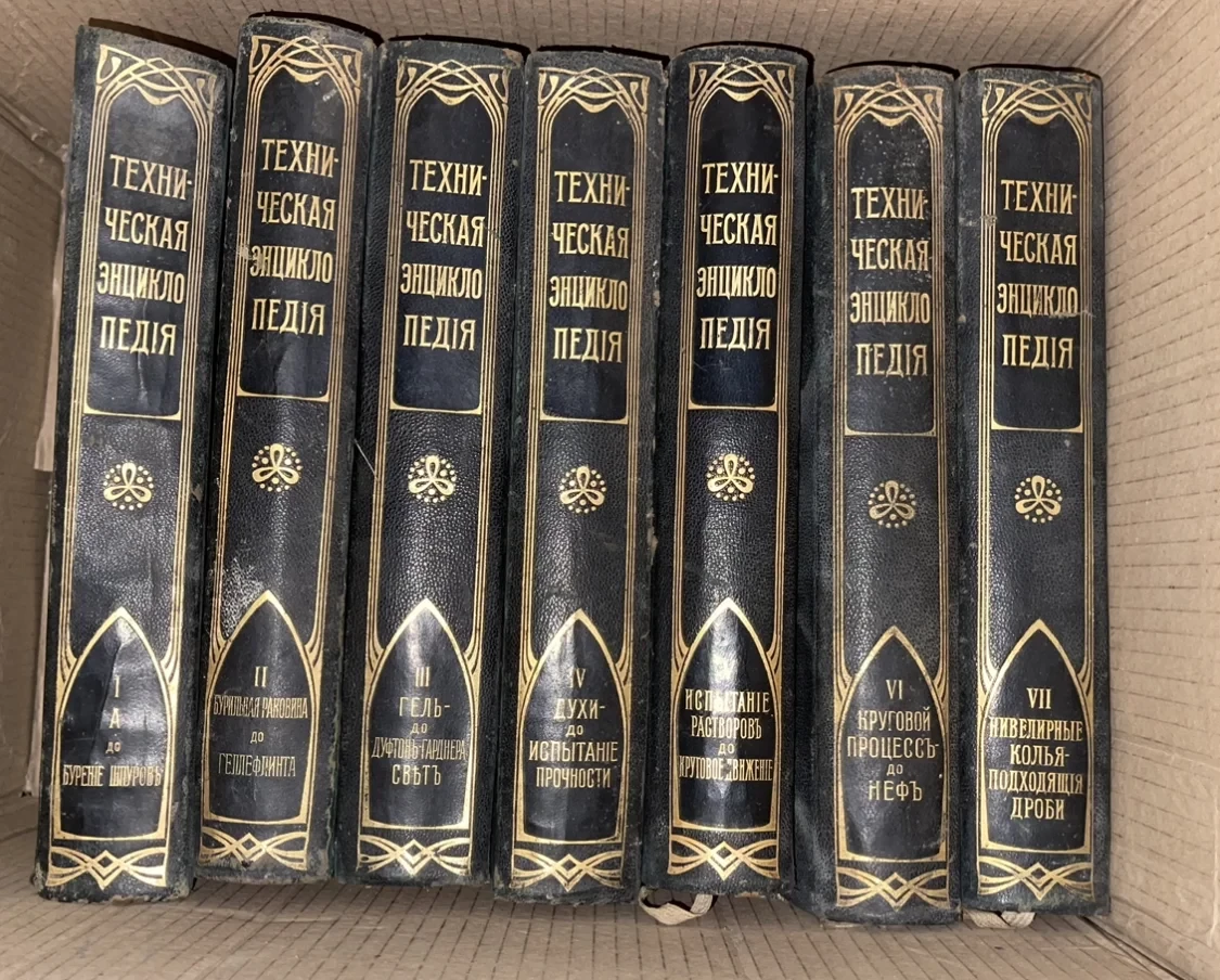 Уникальное собрание томов «Технической энциклопедии», изданное в начале XX века, сохранившее величие инженерной мысли прошлого. Корешки украшены изысканным золотым тиснением в стиле ар-нуво, которое эффектно контрастирует с благородным темным переплетом. Это издание представляет высокую коллекционную ценность и станет статусным элементом интерьера классического кабинета.