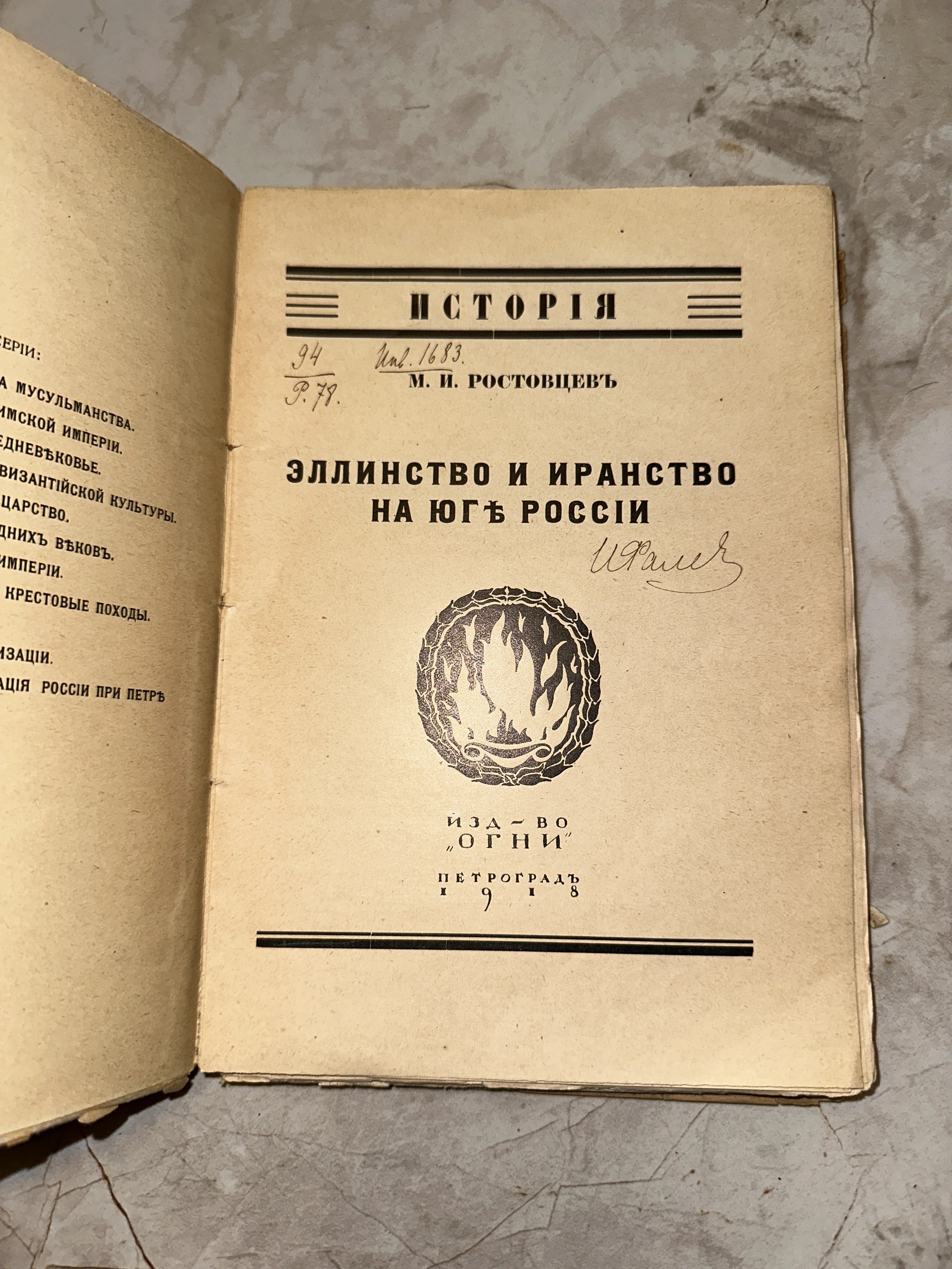 Титульный лист антикварной книги М. И. Ростовцева об эллинстве и иранстве, изданной в Петрограде в 1918 году.