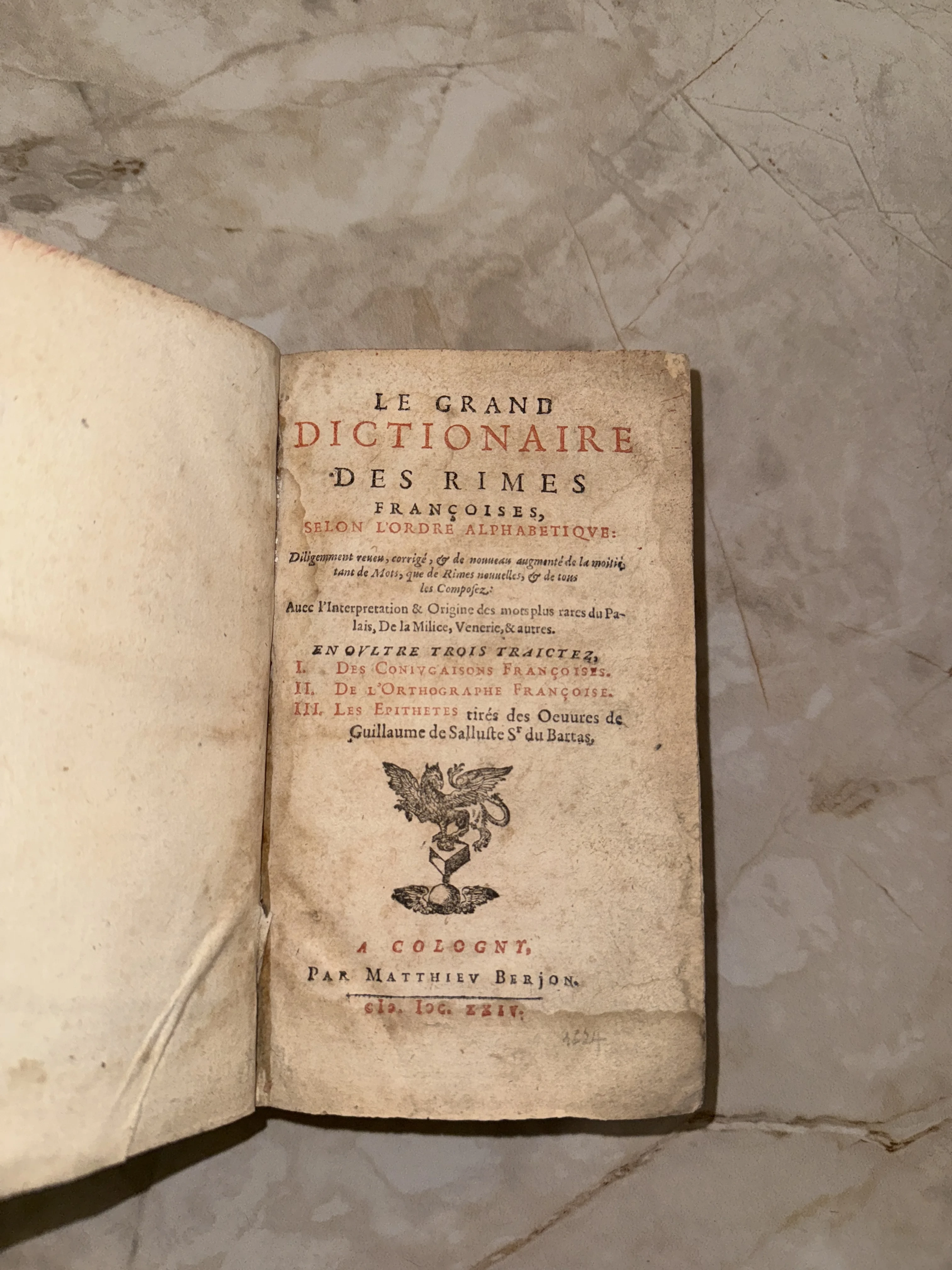 Уникальное издание 'Le Grand Dictionnaire des Rimes', напечатанное в 1624 году в Колоньи. Титульный лист украшен изысканной типографской маркой с изображением грифона и выполнен с использованием классической двухцветной печати. Книга представляет собой выдающийся образец европейского книгопечатания XVII века, сохранивший благородную патину времени и фактуру верже.