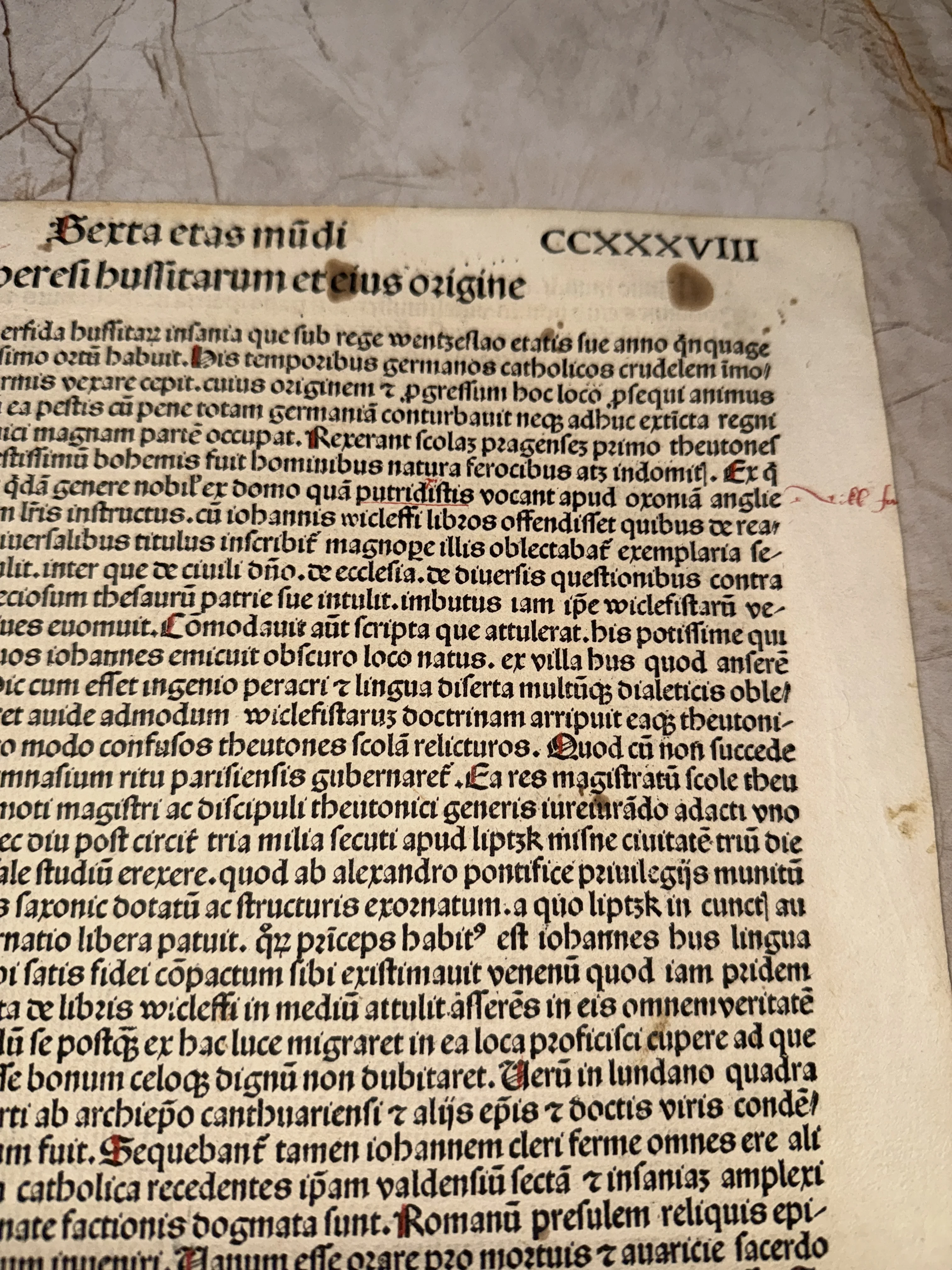 Перед вами подлинный фрагмент знаменитой «Нюрнбергской хроники» — одной из самых ценных инкунабул в истории книгопечатания. Текст на латыни, посвященный эпохе Sexta etas mundi (Шестому возрасту мира), набран каноническим готическим шрифтом и дополнен редкими рукописными пометками на полях. Плотная верже и характерная патина времени подчеркивают исключительную коллекционную ценность этого артефакта XV века.