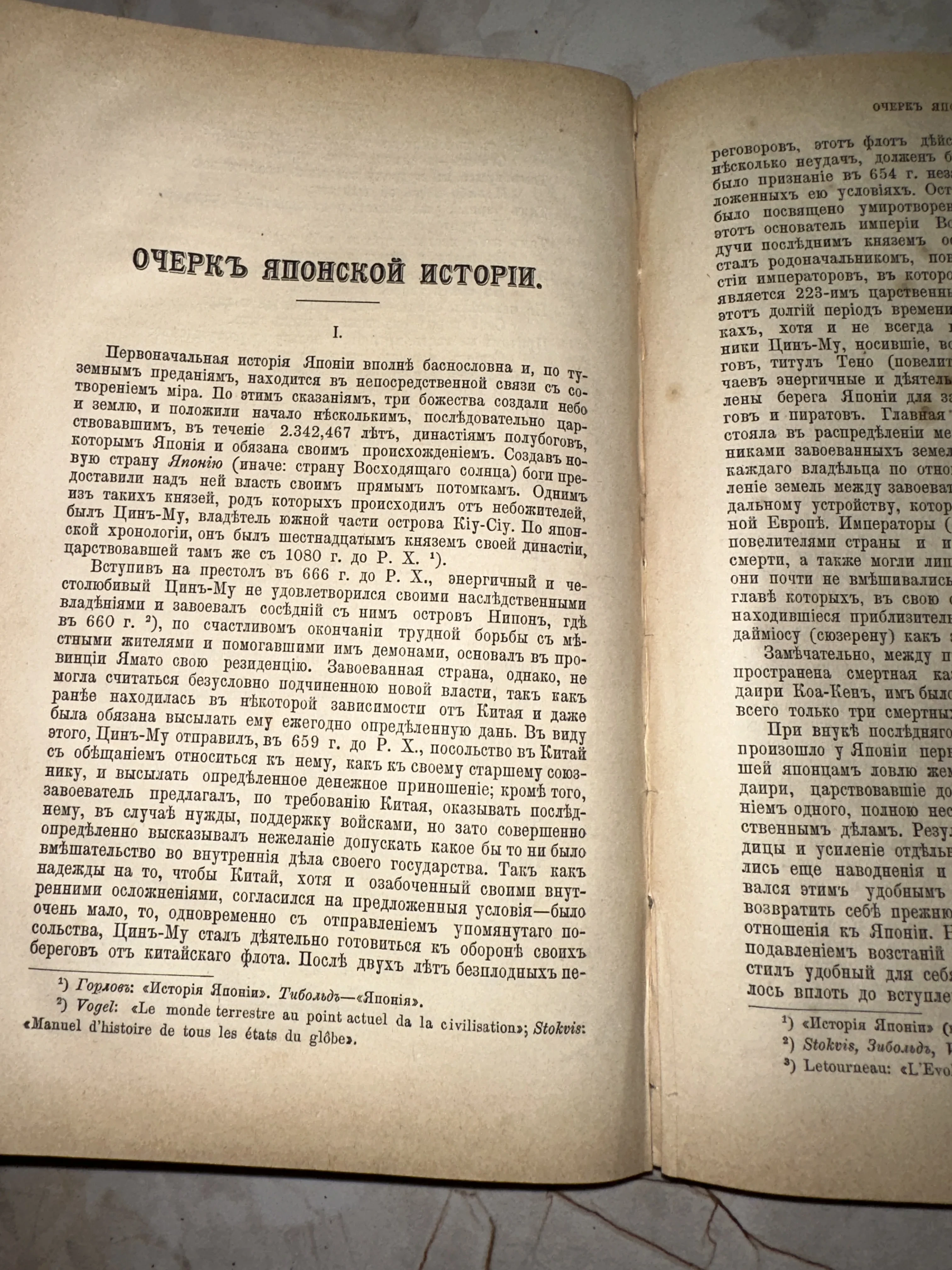 Фотография разворота старинной книги с текстом в дореволюционной орфографии под заголовком «Очеркъ японской исторіи».