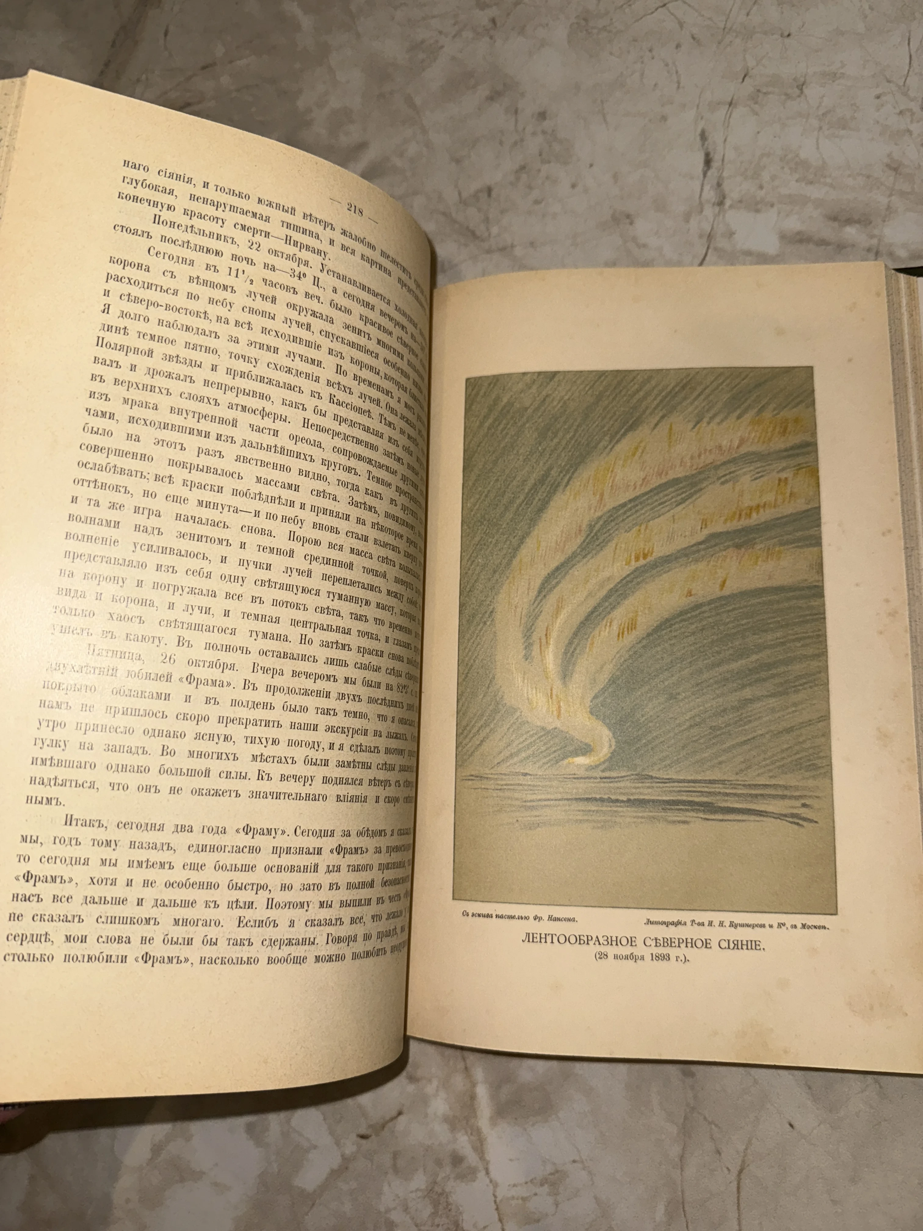 Разворот антикварной книги с текстом на дореволюционном русском языке и цветной литографией лентообразного северного сияния.