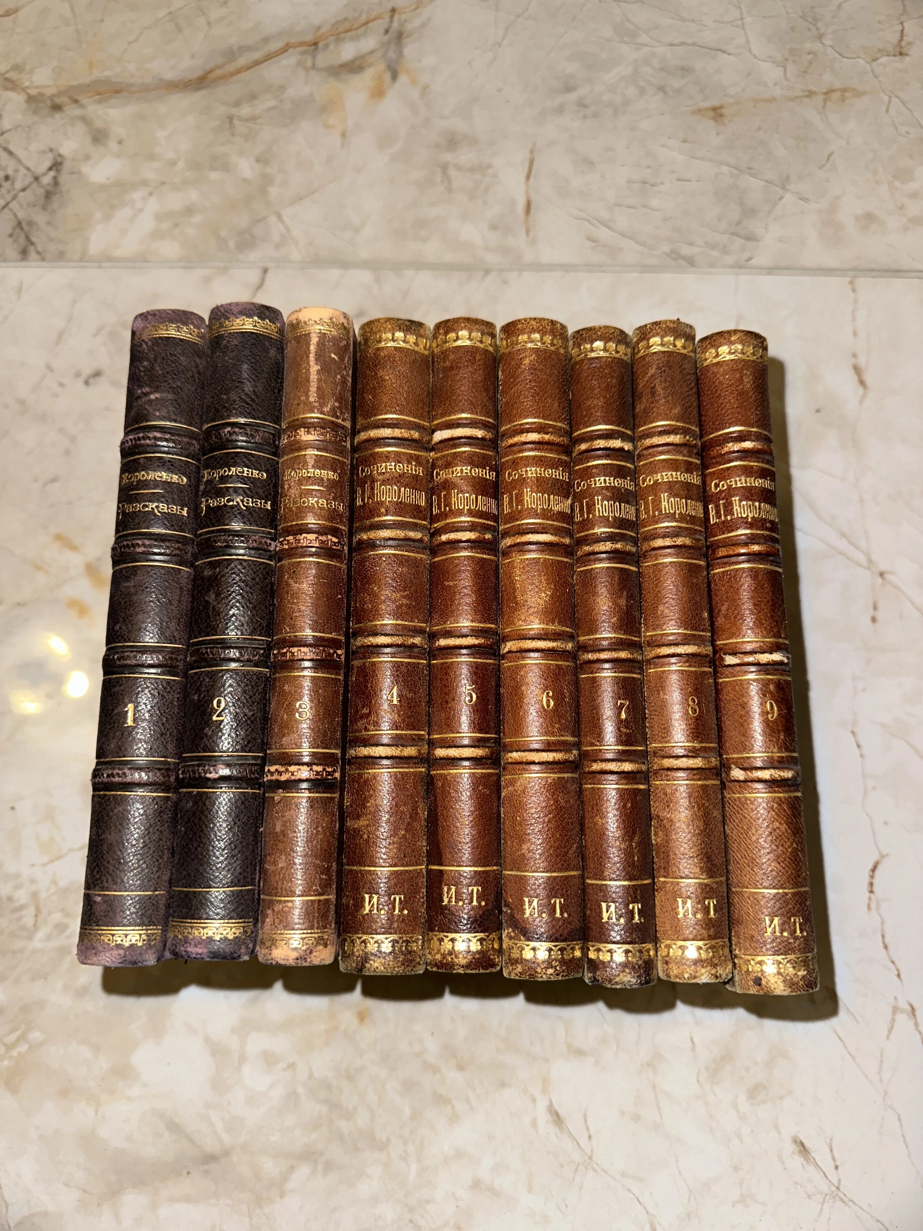 Перед вами великолепное собрание сочинений В. Г. Короленко в аутентичных полукожаных переплетах с рельефными бинтами и золотым тиснением. Благородная патина на коже и легкая потертость корешков придают изданию особую историческую ценность и неповторимый шарм дореволюционной библиотеки. Эти тома станут изысканным украшением интерьера и ценным приобретением для ценителя классической русской литературы.