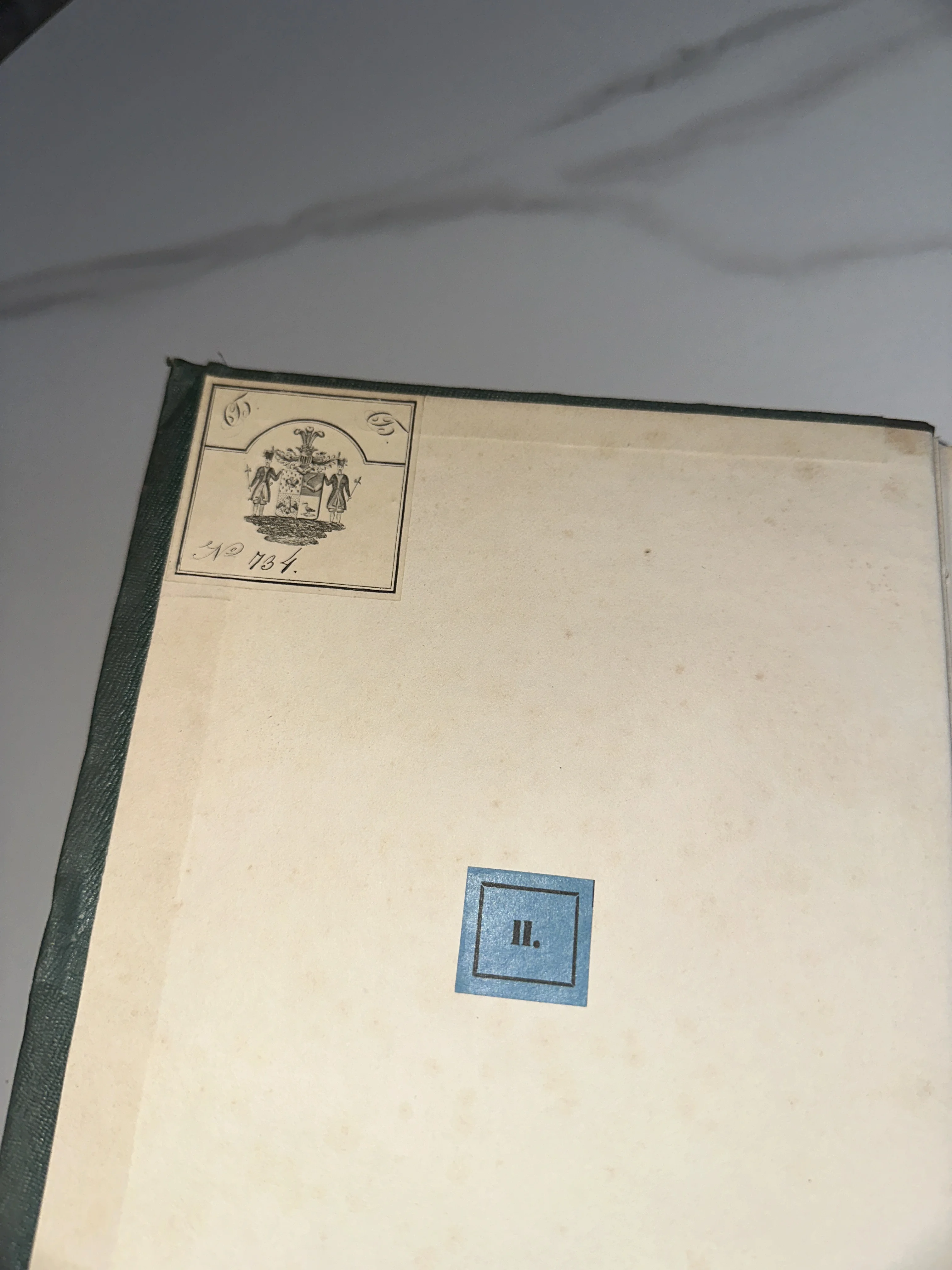 Этот редкий экземпляр отмечен изящным владельческим экслибрисом с гербом, указывающим на принадлежность к богатому частному собранию. Благородная патина времени на бумаге и оригинальные библиотечные пометы создают неповторимую атмосферу подлинного антикварного артефакта.