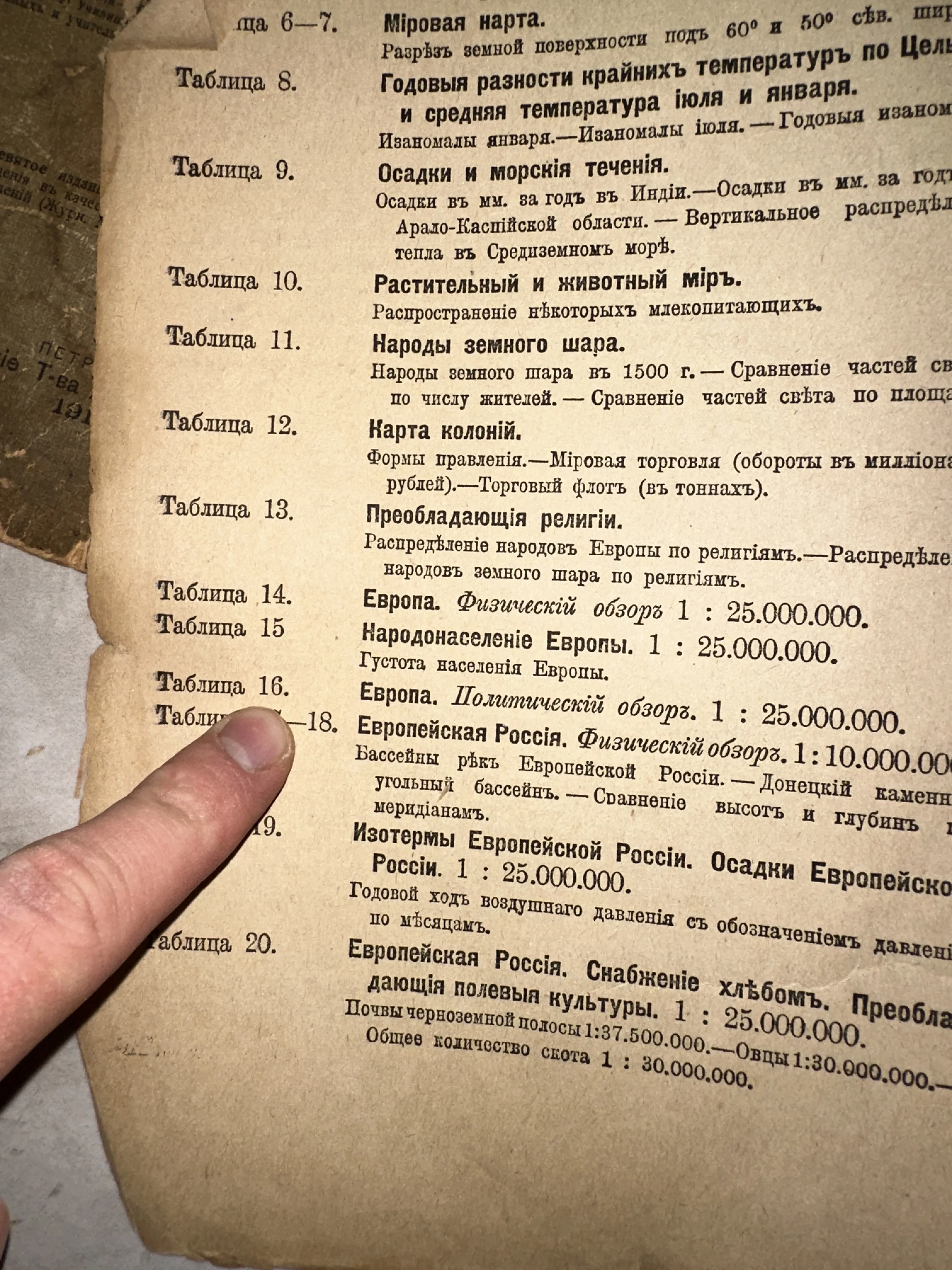 Этот лист представляет собой редкое свидетельство научной мысли прошлого — указатель к дореволюционному географическому атласу. Текст, набранный классической кириллицей с использованием «ятей», описывает карты мировых течений, колоний и народонаселения Европы. Фактурная пожелтевшая бумага и четкая типографская печать сохранили дух великих открытий и строгого академизма рубежа XIX–XX веков.