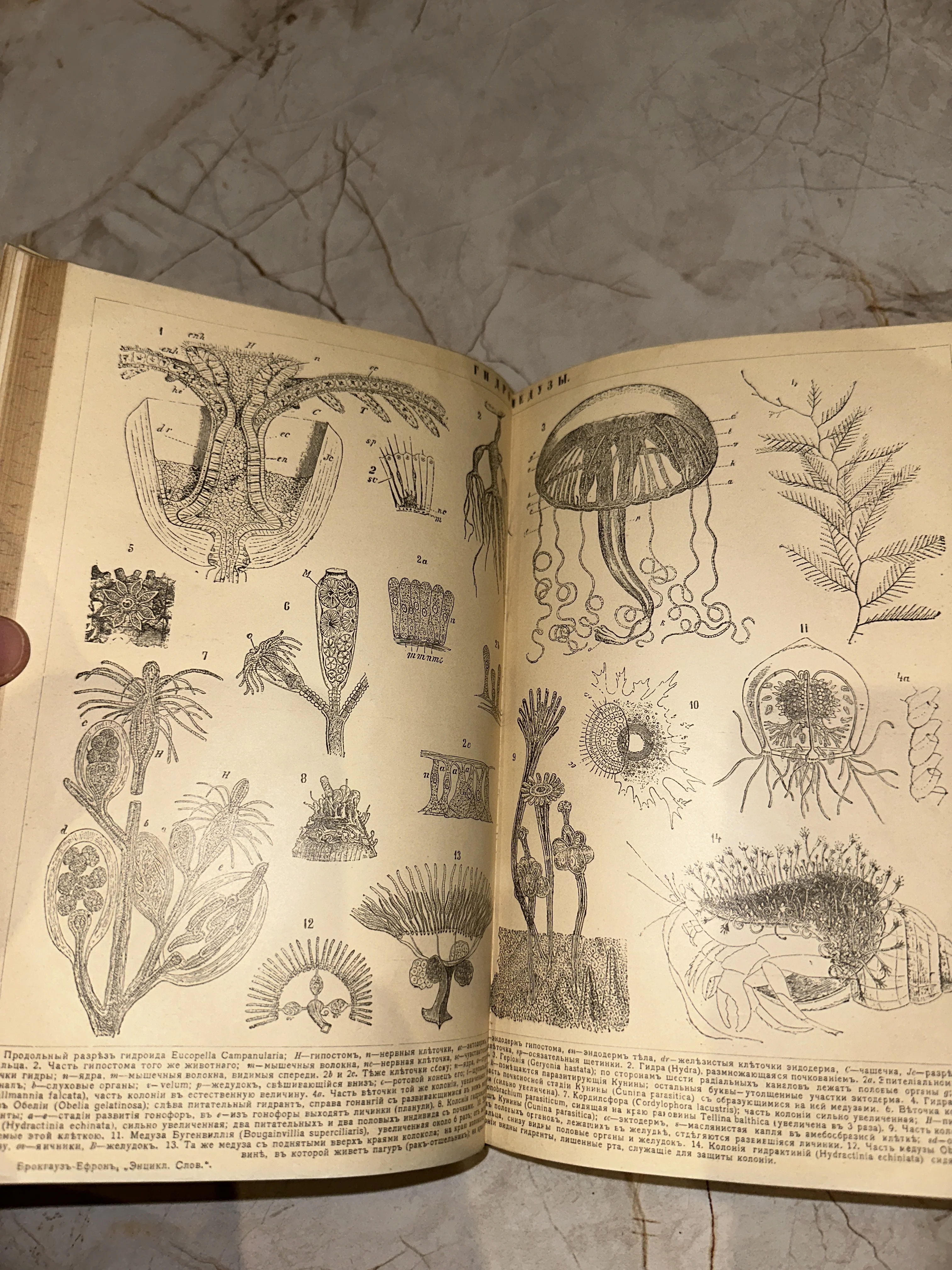 Разворот старинной книги с черно-белыми научными иллюстрациями медуз и гидроидов на пожелтевшей бумаге.