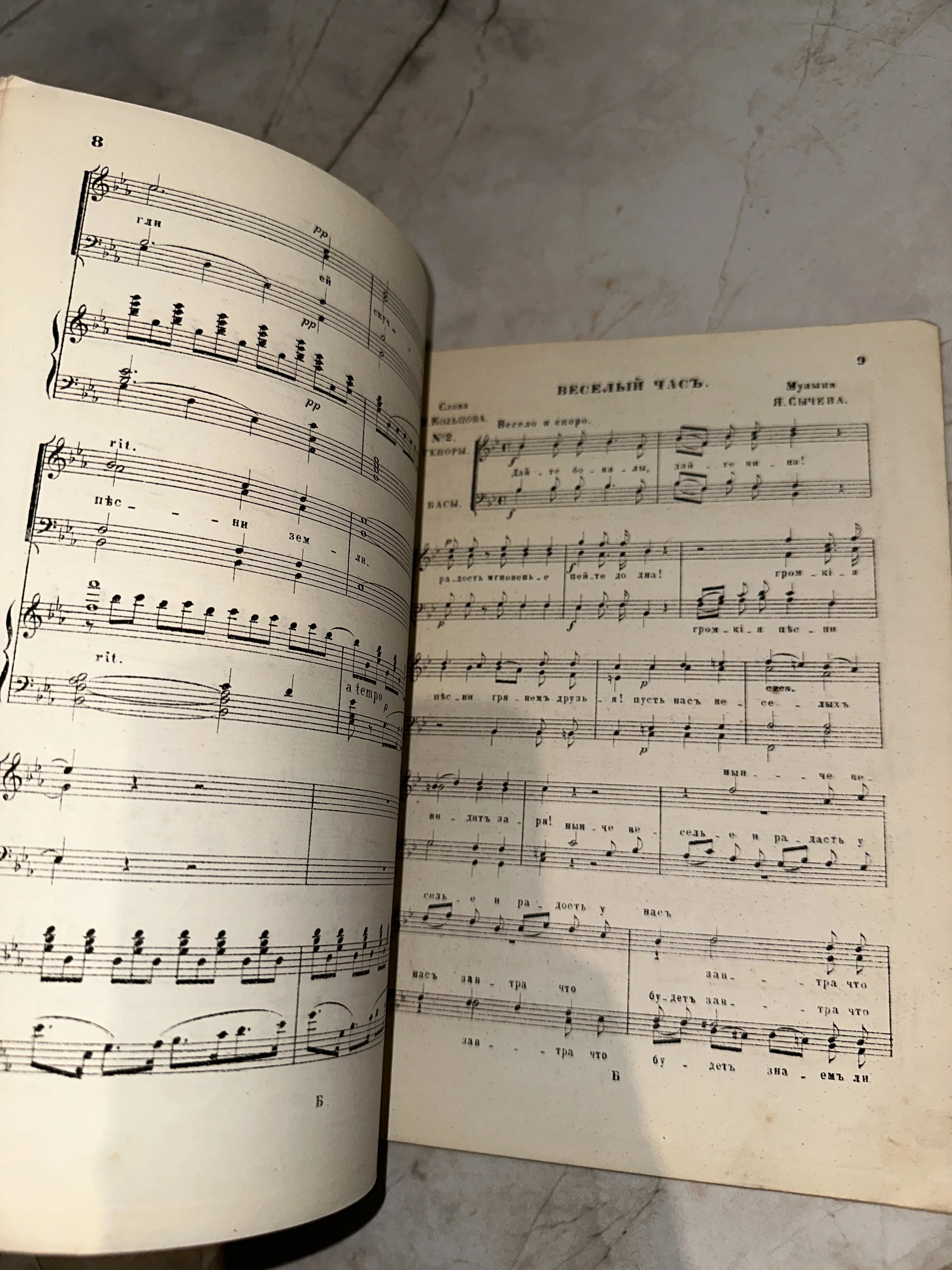 Перед вами уникальный фрагмент музыкальной истории — разворот старинного нотного сборника с произведением «Веселый часъ» на музыку Я. Сычева. Страницы сохранили четкость типографской печати и характерный теплый оттенок состаренной бумаги, передавая атмосферу светских музыкальных вечеров начала XX века. Издание представляет коллекционный интерес для любителей вокального искусства и исследователей дореволюционной культуры.