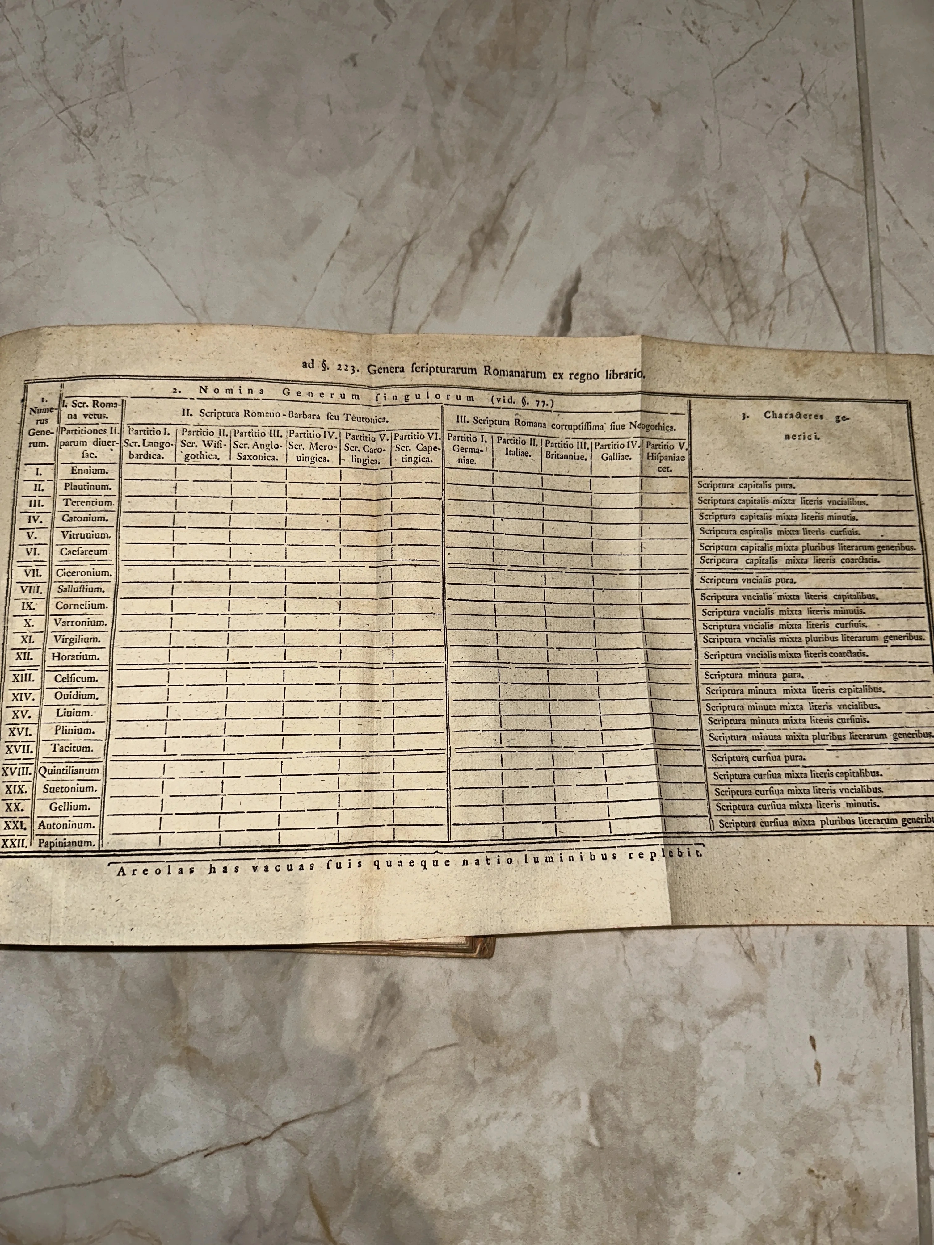 Уникальный образец научной печати, систематизирующий развитие римской письменности и классических авторов от Энния до Папиниана. Тонкая верстка прошлых веков на плотной бумаге сохранила благородную патину времени и исключительную четкость шрифта. Этот лист станет ценным приобретением для коллекционера, увлеченного историей книгопечатания и палеографией.