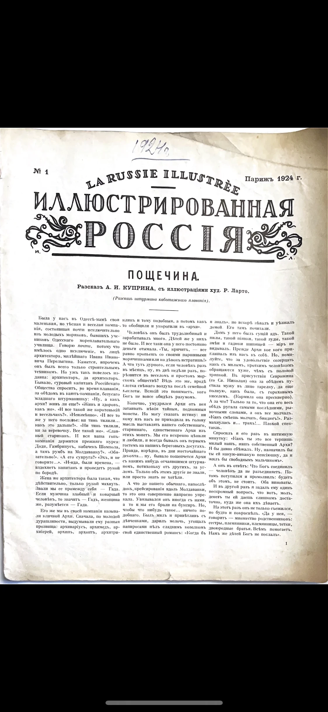 Уникальный экземпляр первого номера знаменитого эмигрантского еженедельника, изданного в Париже. На странице размещено начало рассказа Александра Куприна «Пощечина», сопровождаемое изящной дореволюционной типографикой. Издание прекрасно передает атмосферу культурной жизни русской интеллигенции в изгнании и является ценным коллекционным объектом.
