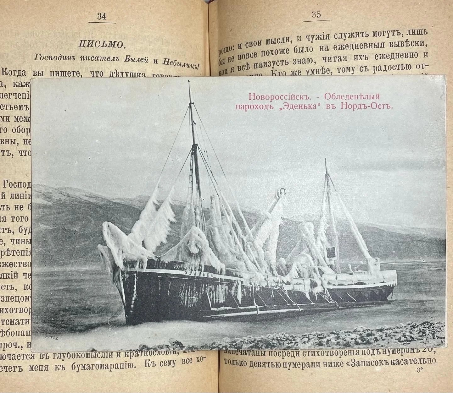 Старинная черно-белая открытка, изображающая пароход Эденька, полностью покрытый льдом в Новороссийской бухте, лежащая на страницах антикварной книги.