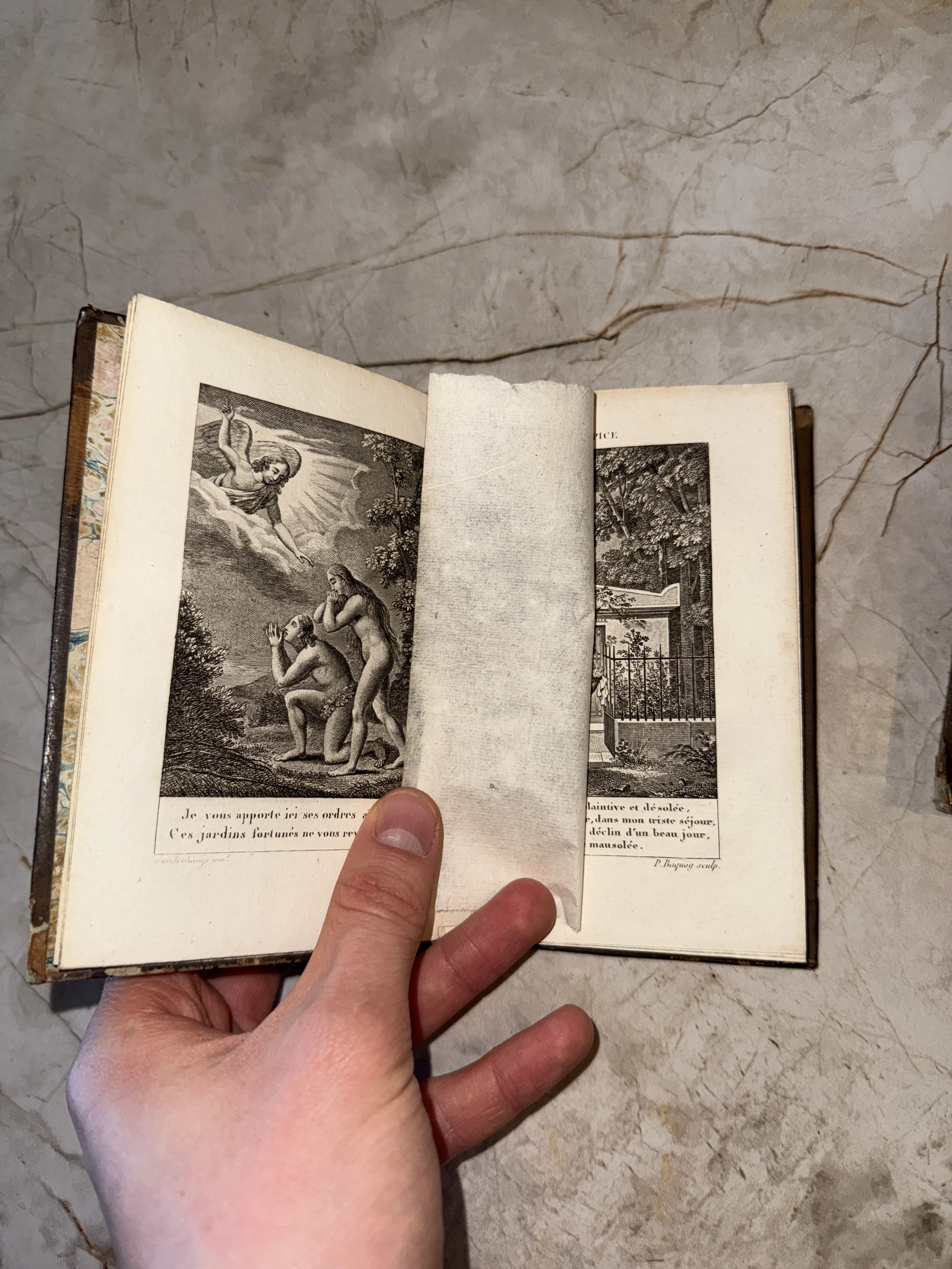 Изящное антикварное издание, сохранившее превосходную четкость классических гравюр и защитную папиросную бумагу. Тонкая проработка деталей в сцене изгнания из Рая и аутентичный французский шрифт подчеркивают коллекционную ценность этой книги. Предмет обладает неповторимым шармом старины и станет достойным пополнением частной библиотеки.