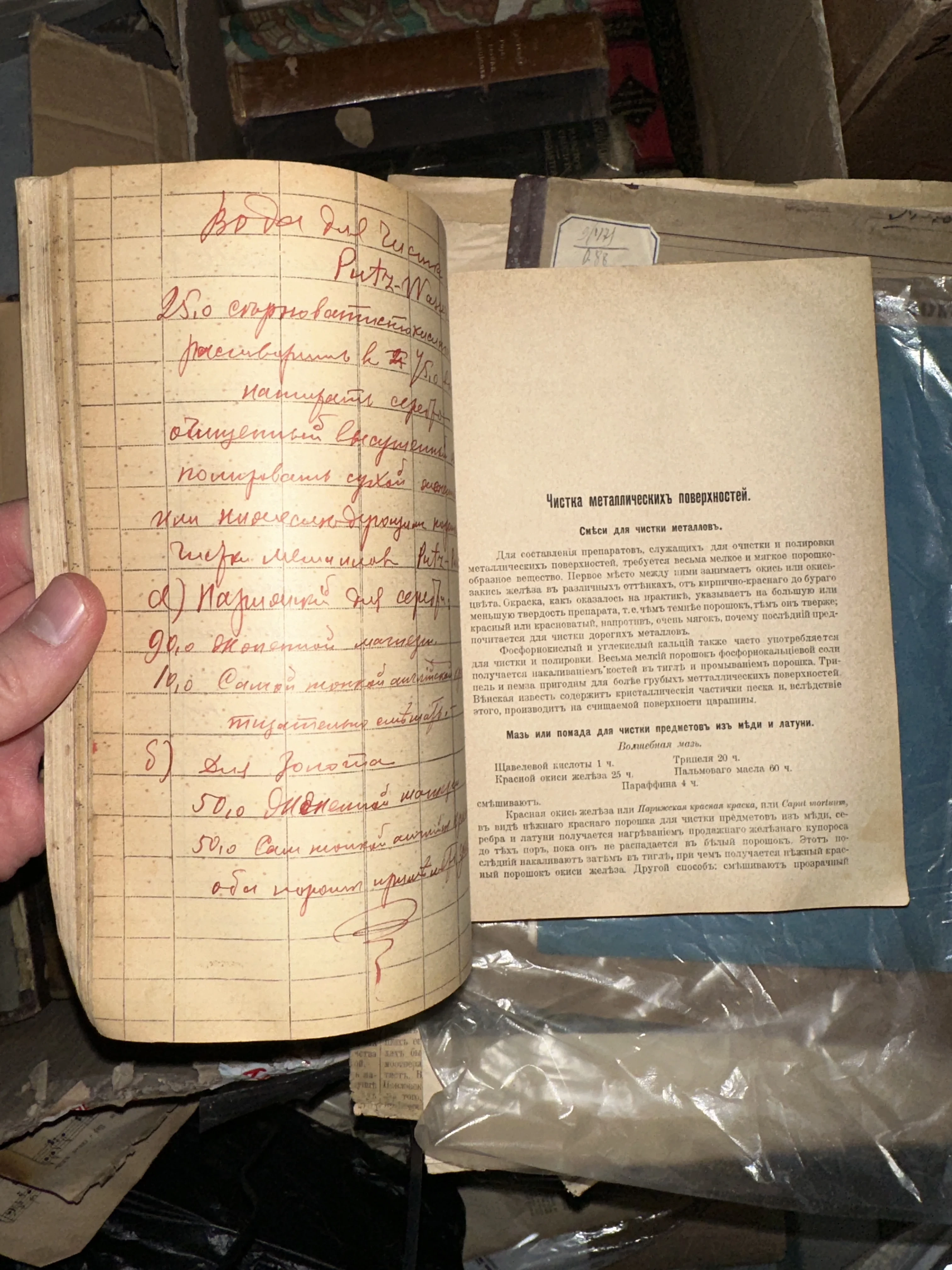 Раскрытая дореволюционная книга с рукописными рецептами для чистки серебра и печатным текстом о чистке металлических поверхностей.