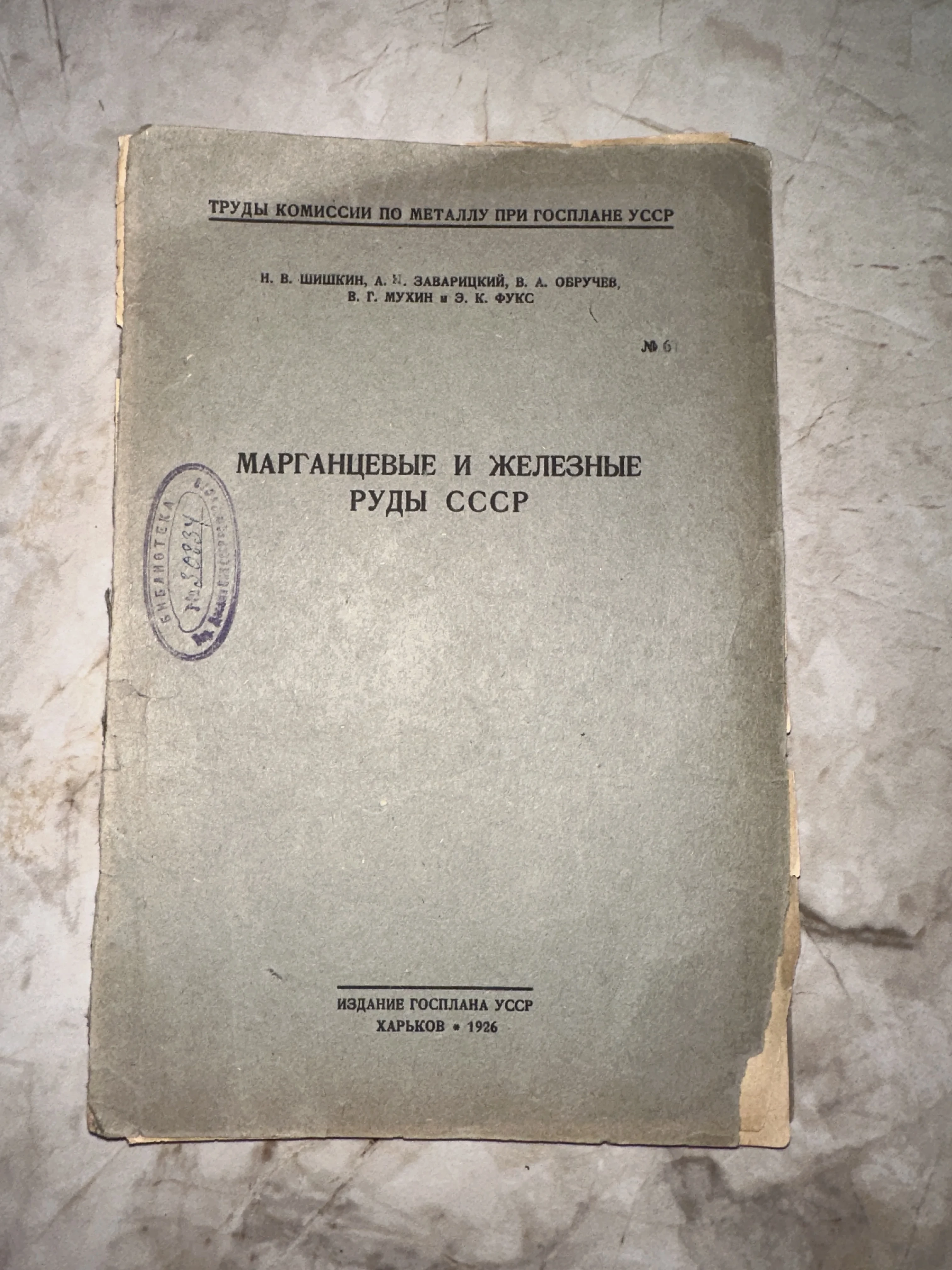Редкий экземпляр трудов Комиссии по металлу, в состав авторов которого вошел знаменитый академик В. А. Обручев. Издание в оригинальной мягкой обложке с аутентичным библиотечным штампом отражает дух раннесоветской индустриализации и научного поиска. Книга сохранила естественную патину времени, представляя высокую коллекционную ценность для историков науки и геологии.