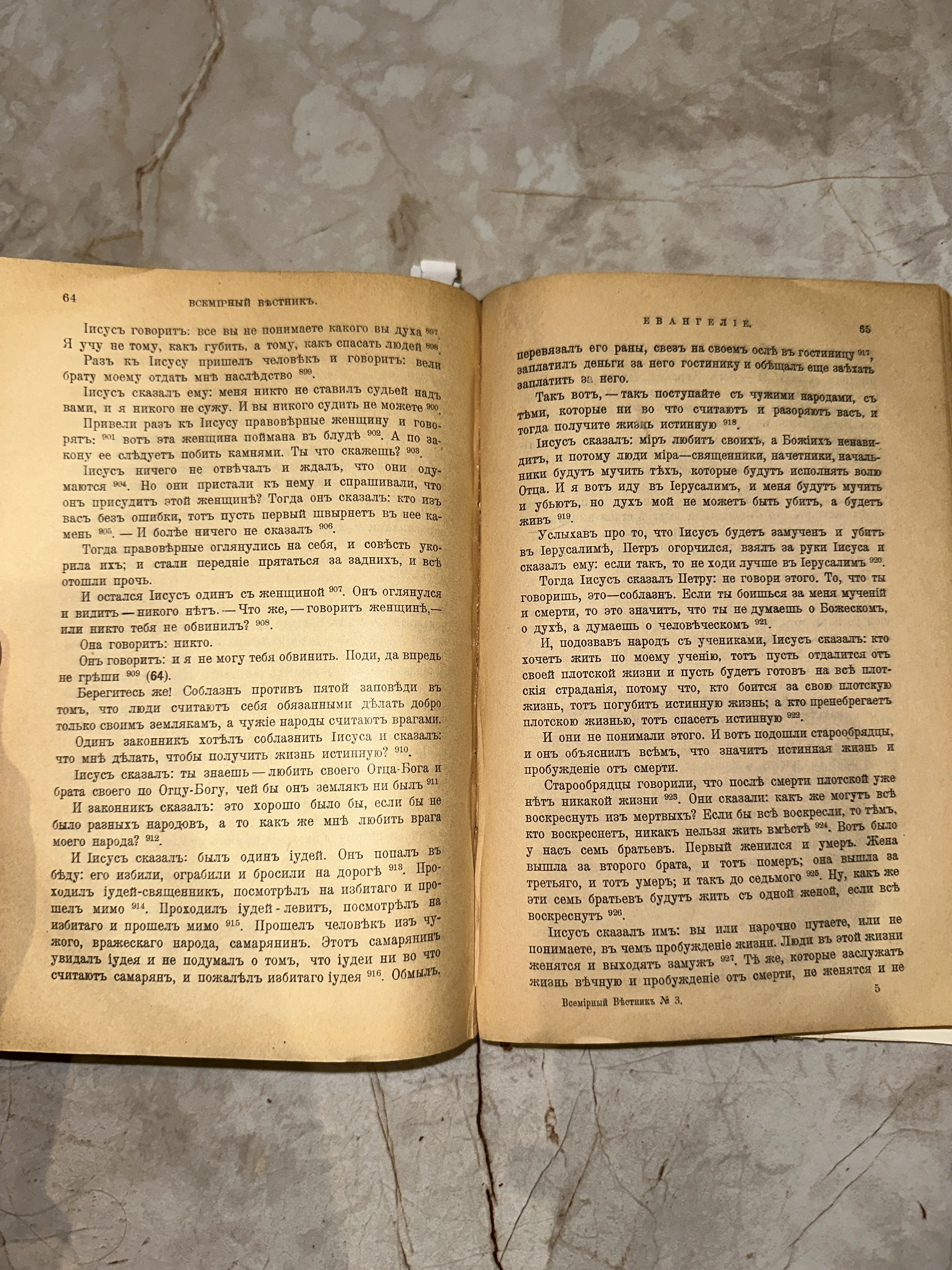 Разворот старинного издания с текстом на дореволюционном русском языке, заголовки «Всемирный вестник» и «Евангелие».
